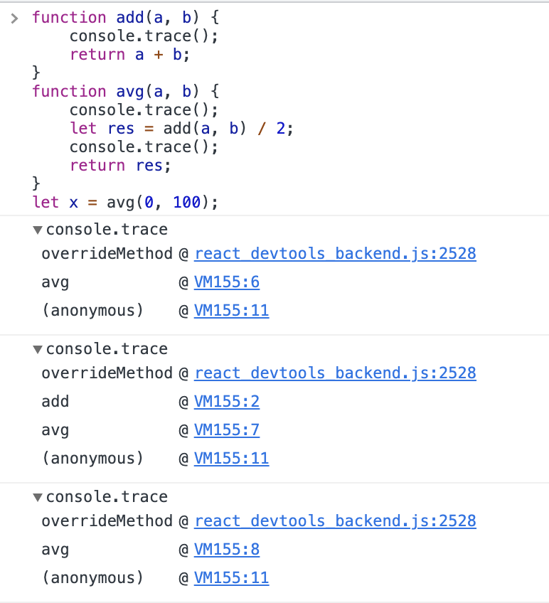 这是因为在代码的第2、6和8行,打印了三次调用栈的信息。由于avg函数第一个执行trace命令,是在调用add之前,所以首先打印在console中的调用信息属于avg函数,随后是add函数,最后是avg调用完add之后的第二次打印。