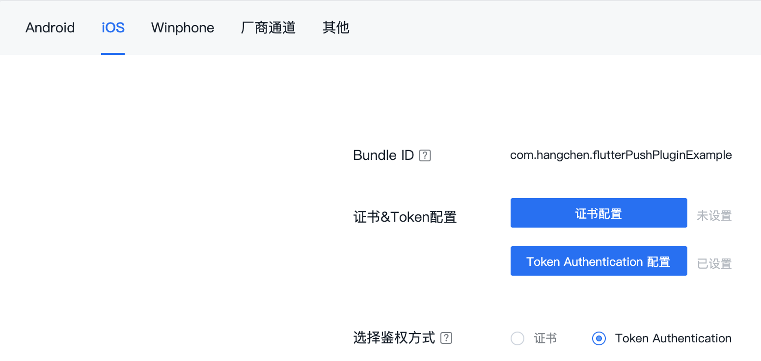 在拿到了APNs Auth Key之后,我们同样需要去极光官网,根据Bundle ID进行推送设置,并把Auth Key上传至极光进行托管,由它完成与苹果的鉴权工作: