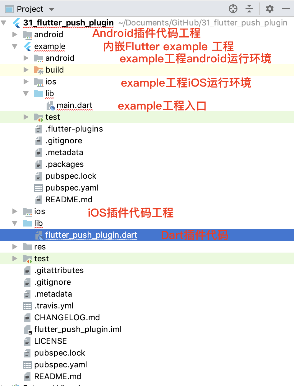 Flutter的插件工程与普通的应用工程类似,都有android和ios目录,这也是我们完成平台相关逻辑代码的地方,而Flutter工程插件的注册,则仍会在应用的入口完成。除此之外,插件工程还内嵌了一个example工程,这是一个引用了插件代码的普通Flutter应用工程。我们通过example工程,可以直接调试插件功能。