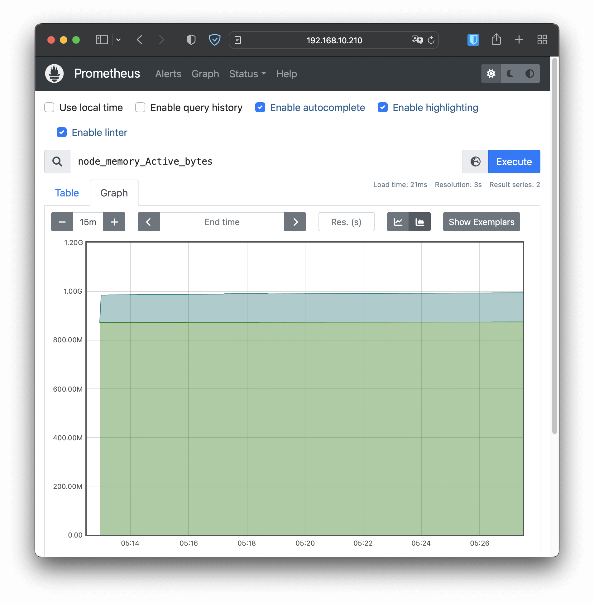 Web界面上有一个查询框,可以使用PromQL来查询指标,生成可视化图表,比如在这个截图里我就选择了“node_memory_Active_bytes”这个指标,意思是当前正在使用的内存容量。