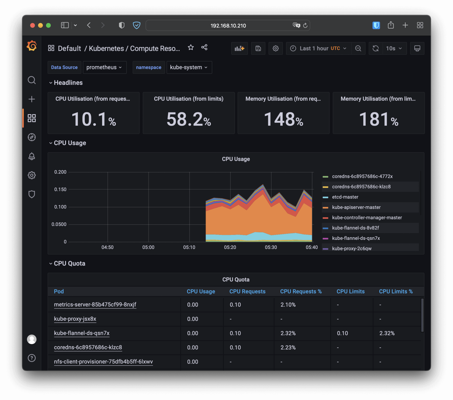 比如我选择了“Kubernetes / Compute Resources / Namespace (Pods)”这个仪表盘,就会出来一个非常漂亮图表,比Metrics Server的 kubectl top 命令要好看得多,各种数据一目了然: