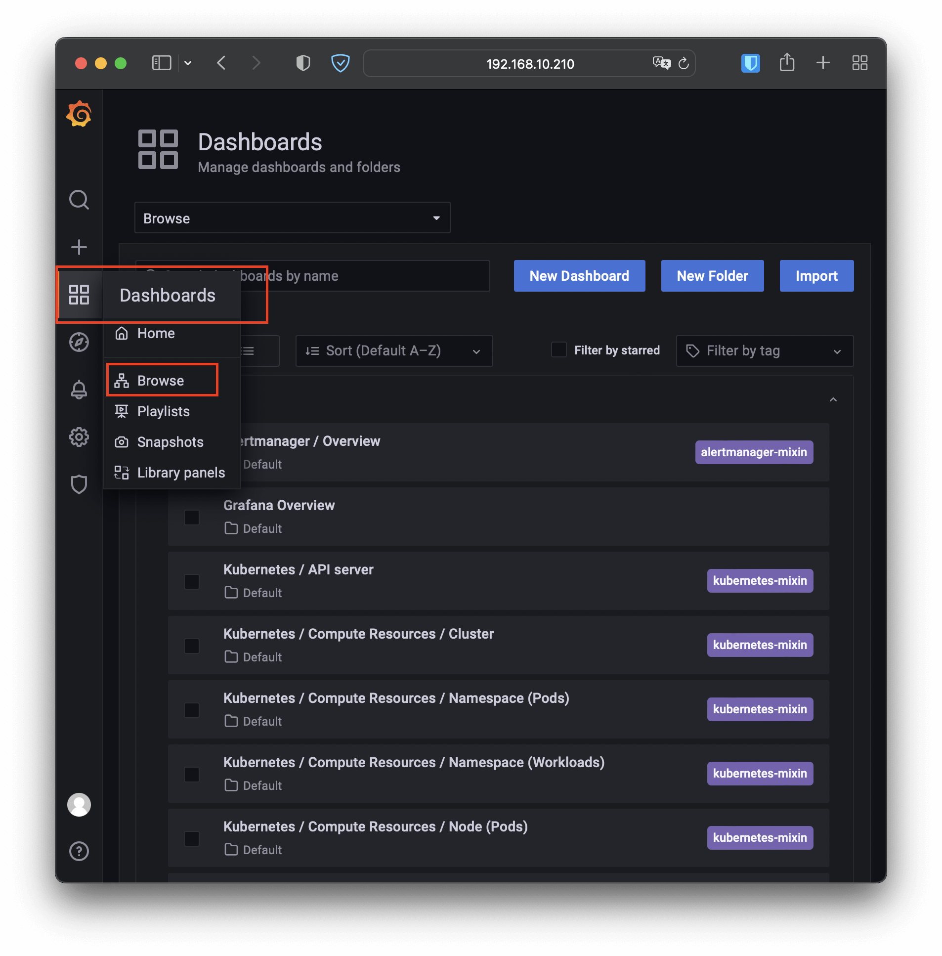 Grafana内部已经预置了很多强大易用的仪表盘,你可以在左侧菜单栏的“Dashboards - Browse”里任意挑选一个: