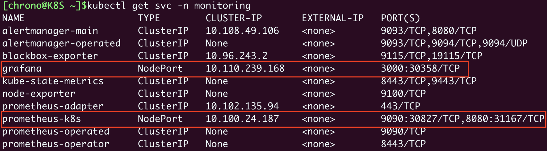 1 | kubectl get svc -n monitoring |