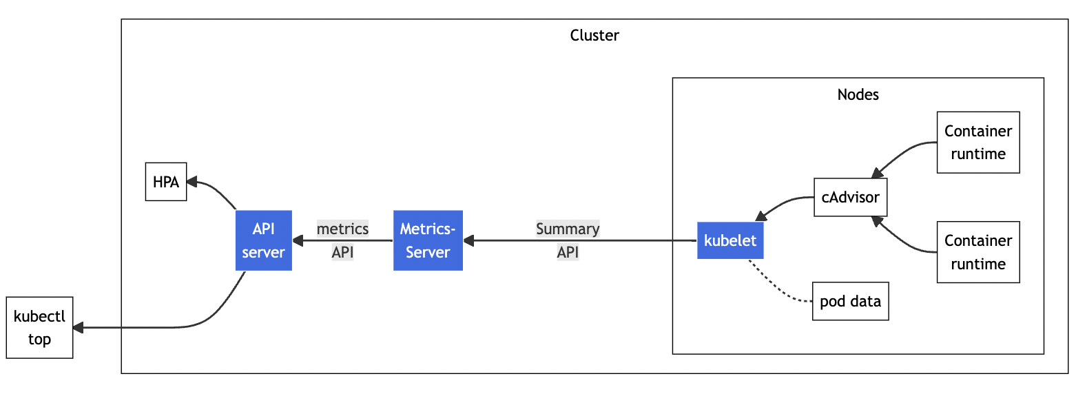 下面的这张图来自Kubernetes官网,你可以对Metrics Server的工作方式有个大概了解:它调用kubelet的API拿到节点和Pod的指标,再把这些信息交给apiserver,这样kubectl、HPA就可以利用apiserver来读取指标了: