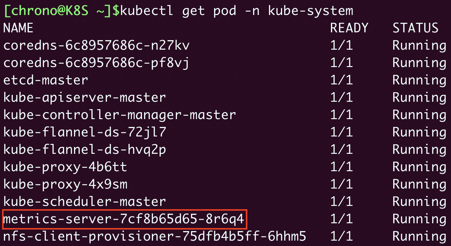 Metrics Server属于名字空间“kube-system”,可以用 kubectl get pod 加上 -n 参数查看它是否正常运行:
