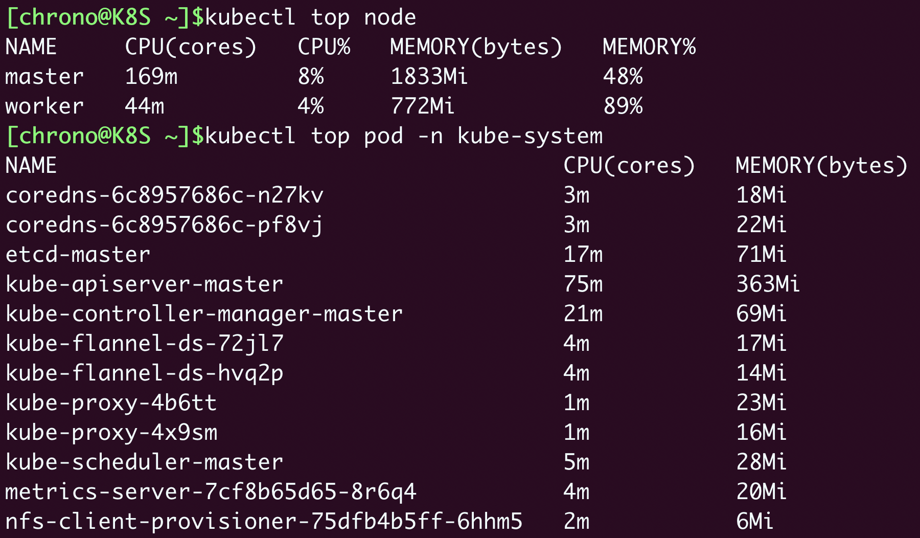- 集群里两个节点CPU使用率都不高,分别是8%和4%,但内存用的很多,master节点用了差不多一半(48%),而worker节点几乎用满了(89%)。