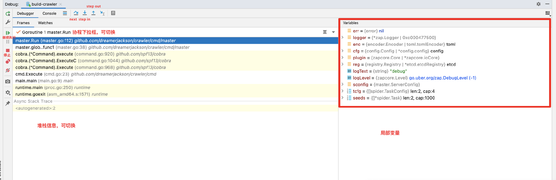(dlv) stack 0 0x0000000002071659 in github.com/dreamerjackson/crawler/cmd/worker.Run at ./cmd/worker/worker.go:135 1 0x00000000020702cb in github.com/dreamerjackson/crawler/cmd/worker.glob..func1 at ./cmd/worker/worker.go:44 2 0x0000000002058734 in github.com/spf13/cobra.(*Command).execute at /Users/jackson/go/pkg/mod/github.com/spf13/cobra@v1.6.1/command.go:920 3 0x00000000020596c6 in github.com/spf13/cobra.(*Command).ExecuteC at /Users/jackson/go/pkg/mod/github.com/spf13/cobra@v1.6.1/command.go:1044 4 0x0000000002058c8f in github.com/spf13/cobra.(*Command).Execute at /Users/jackson/go/pkg/mod/github.com/spf13/cobra@v1.6.1/command.go:968 5 0x0000000002089e5d in github.com/dreamerjackson/crawler/cmd.Execute at ./cmd/cmd.go:23 6 0x0000000002089e97 in main.main at ./main.go:9 7 0x000000000103e478 in runtime.main at /usr/local/opt/go/libexec/src/runtime/proc.go:250 8 0x000000000106fee1 in runtime.goexit at /usr/local/opt/go/libexec/src/runtime/asm_amd64.s:1571