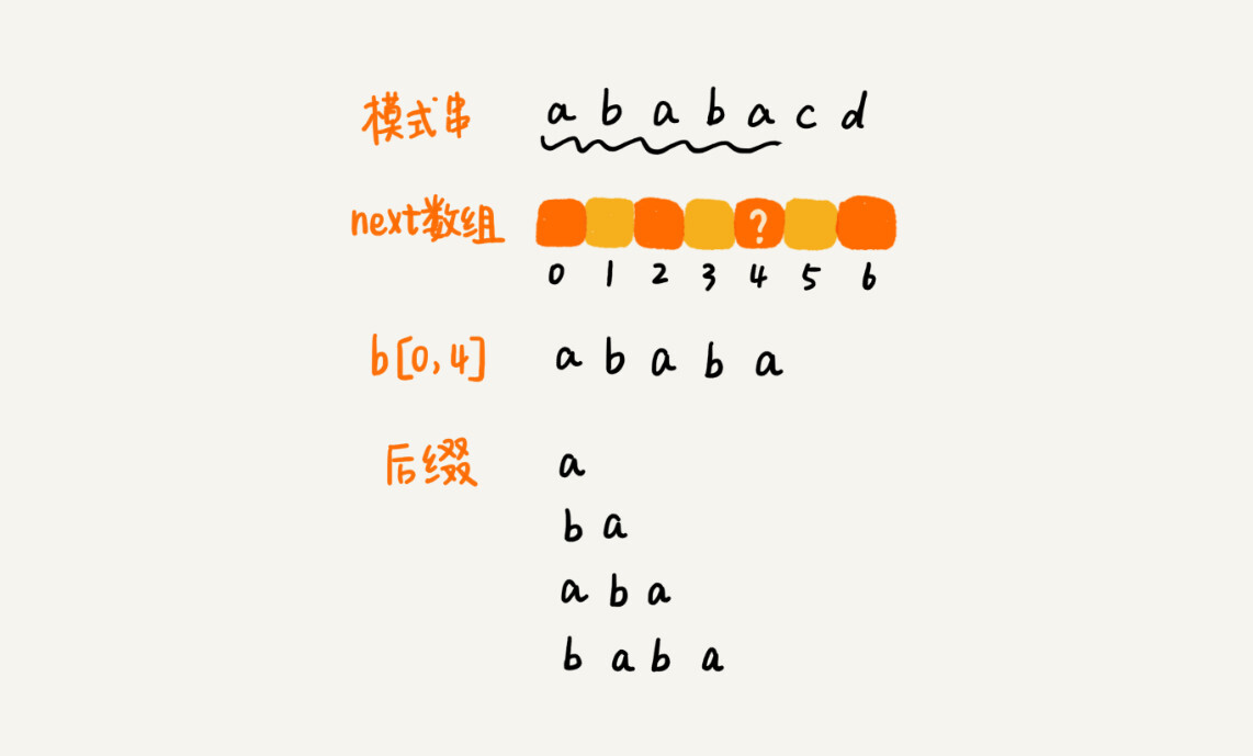 当然,我们可以用非常笨的方法,比如要计算下面这个模式串b的next[4],我们就把b[0, 4]的所有后缀子串,从长到短找出来,依次看看,是否能跟模式串的前缀子串匹配。很显然,这个方法也可以计算得到next数组,但是效率非常低。有没有更加高效的方法呢?