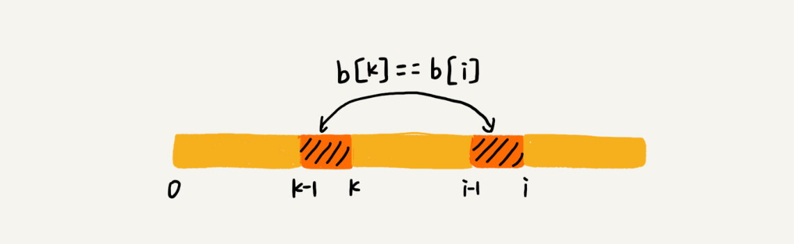 按照这个思路,我们可以考察完所有的b[0, i-1]的可匹配后缀子串b[y, i-1],直到找到一个可匹配的后缀子串,它对应的前缀子串的下一个字符等于b[i],那这个b[y, i]就是b[0, i]的最长可匹配后缀子串。