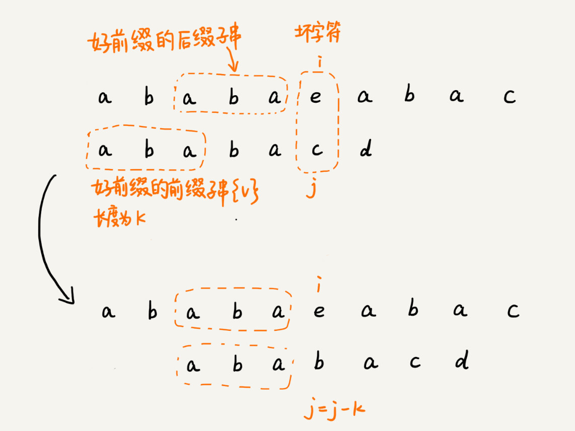 我们只需要拿好前缀本身,在它的后缀子串中,查找最长的那个可以跟好前缀的前缀子串匹配的。假设最长的可匹配的那部分前缀子串是{v},长度是k。我们把模式串一次性往后滑动j-k位,相当于,每次遇到坏字符的时候,我们就把j更新为k,i不变,然后继续比较。