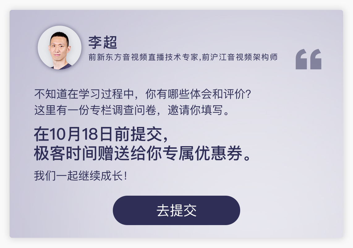 当然,本专栏只是学习音视频相关知识的一个开始,而音视频知识纷繁复杂,不可能通过一个专栏就将所有的音视频知识全部学通。对于在学习本专栏之前从没有接触过音视频技术的同学来说,还要学习一些音视频相关的其他知识,如 H264 的基本工作原理、YUV 数据格式、如何通过 FFmpeg 进行音视频的编解码、音视频该如何进行同步、移动端/PC端使用 WebRTC 与浏览器的区别、如何实现 SFU流媒体服器等等,以上这些都是你进一步需要重点学习的知识。
