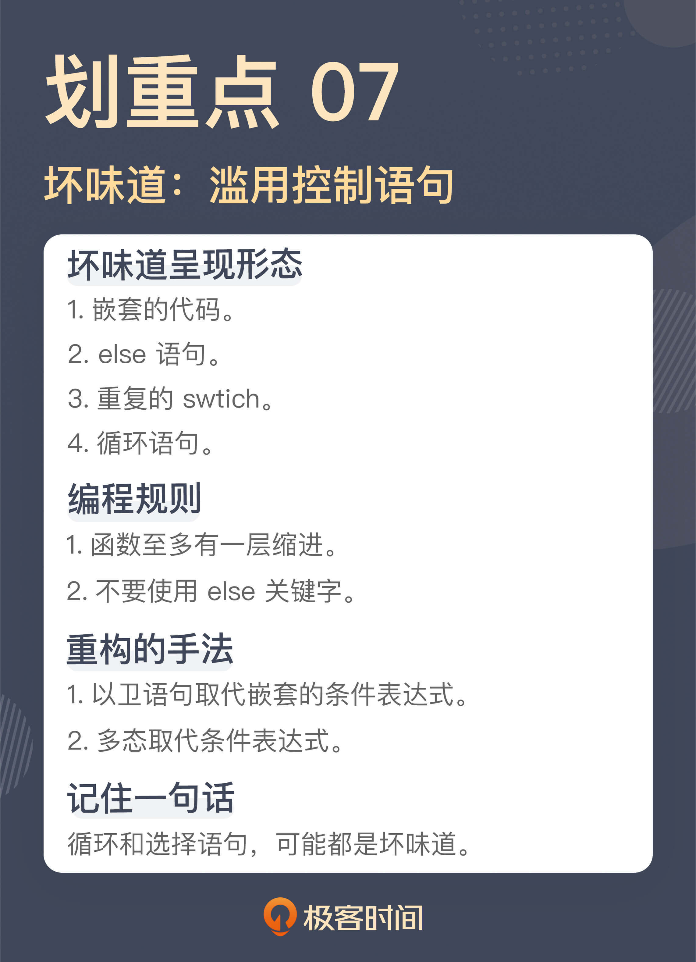 其实,关于控制语句还有一个坏味道,那就是循环语句。没错,循环本身就是一个坏味道,但讲解它还需要一些知识的铺垫,所以,我会把它放到后面第13节,讲“落后的代码风格”时再来讲解。这里,你只要知道循环语句也是一个坏味道就够了。