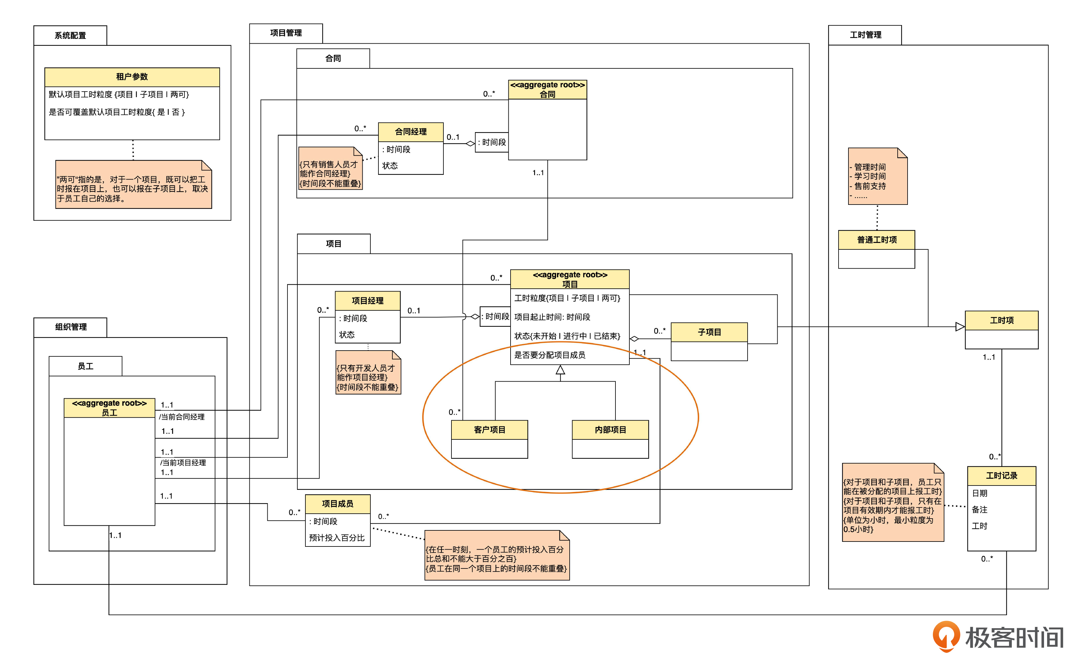 另一种是先识别出父类,然后发现这个类中的不同对象有一些显著的差异,需要再分成两个子类。例如第23课,我们先识别出项目,然后发现“客户项目有合同,内部项目没有合同”这一差异,于是可以识别出客户项目和内部项目两个子类。