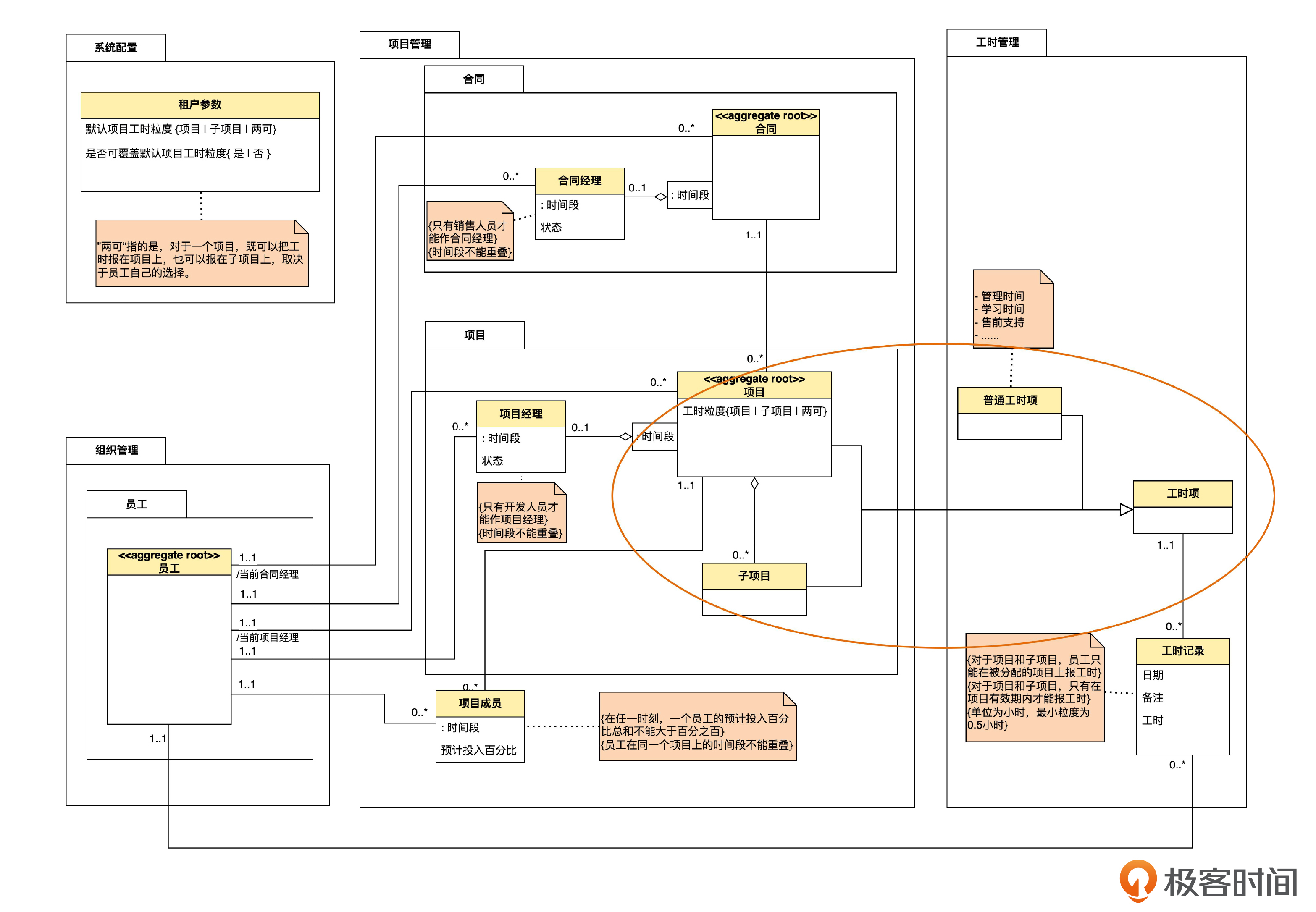 一个方向是先识别出了子类,然后从子类中归纳出共性,形成父类。比如在第22课,我们先识别出项目和子项目,然后发现这两者都能报工时,也就是说具有能够报工时这个共性,于是识别出了工时项这个表示共性的父类。