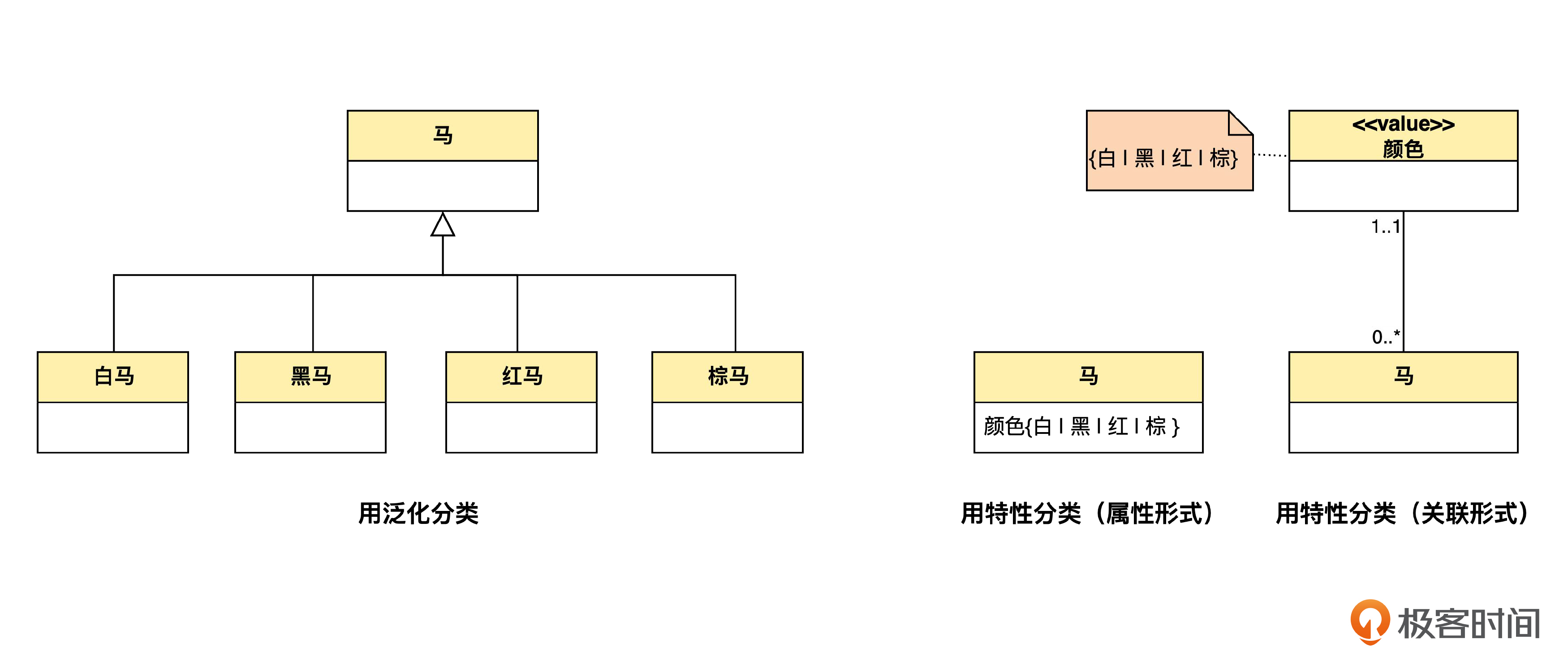理论上,所有的分类都可以用泛化来表示。但泛化并不是表示分类的唯一的方式,当几类事物只有特性值不同的时候,可以通过特性值来表示分类。