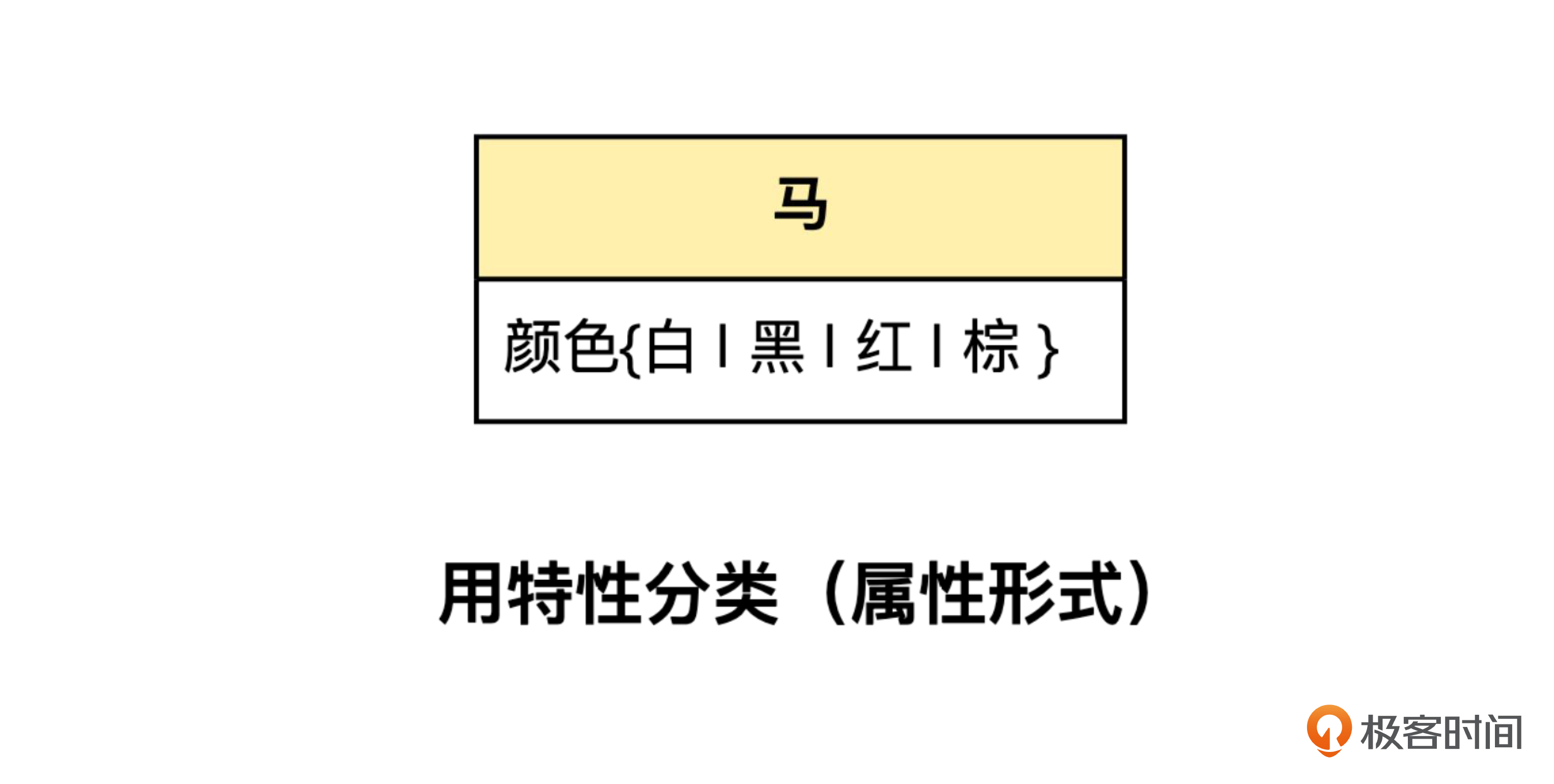 注意一下我们这里说“特性种类”和“特性值”时的区别。圆形有“直径”而矩形没有,反之,矩形有“长边长度”,而圆形没有,所以我们说圆形和矩形的“特性种类”不同。而不同颜色的马,都有颜色这个特性,所以特性种类是相同的,只是特性的值不同。