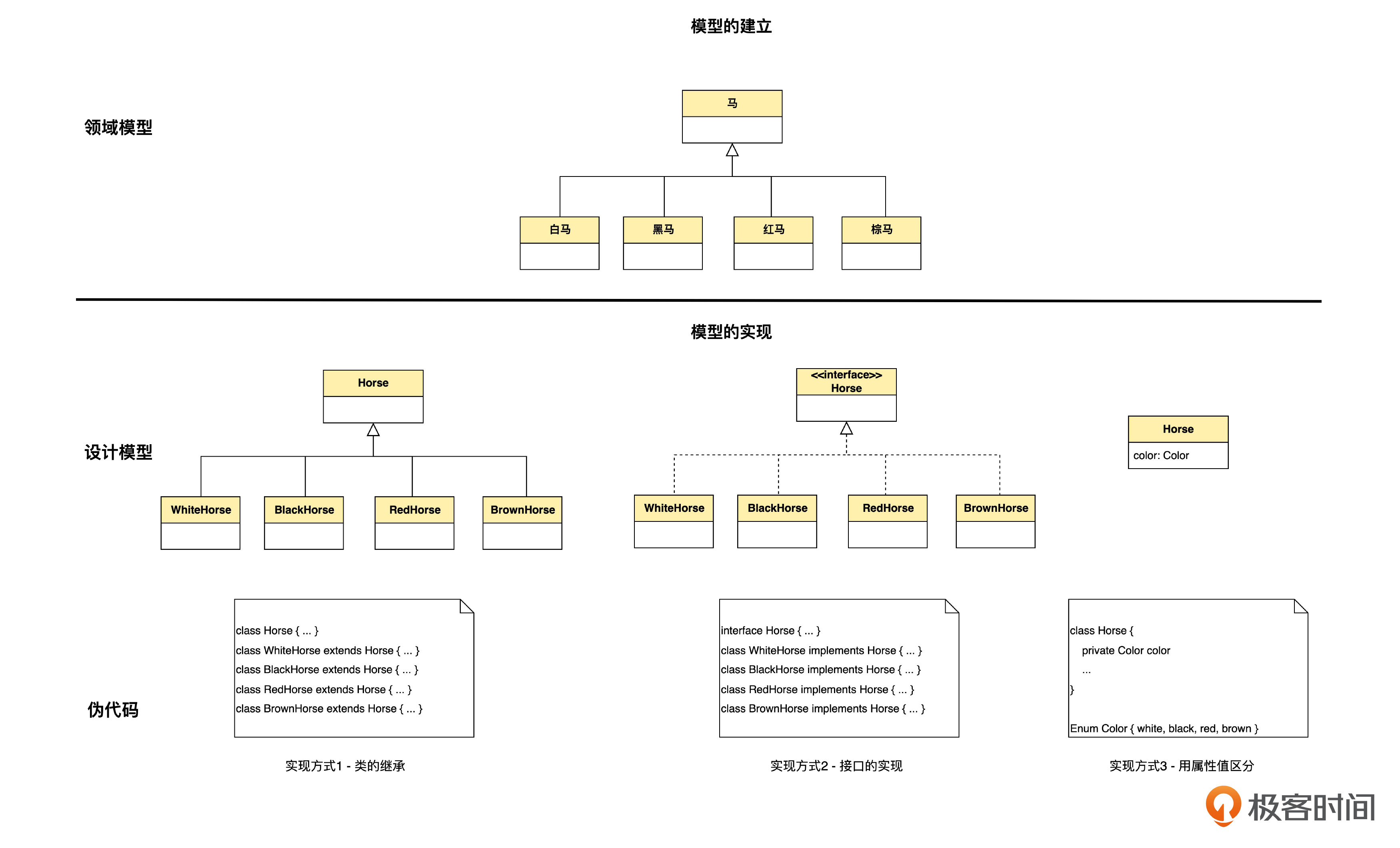 就这个例子而言,假定除了颜色不同,各种马的特性种类、操作等都是相同的,那么,用特性值区分的实现方式就是合理的,而继承是不合理的。那么架构师就可以建议,在领域模型中,也采用特性值区分的方式,以便保证领域模型和实现的一致性。也就是下面的方式。