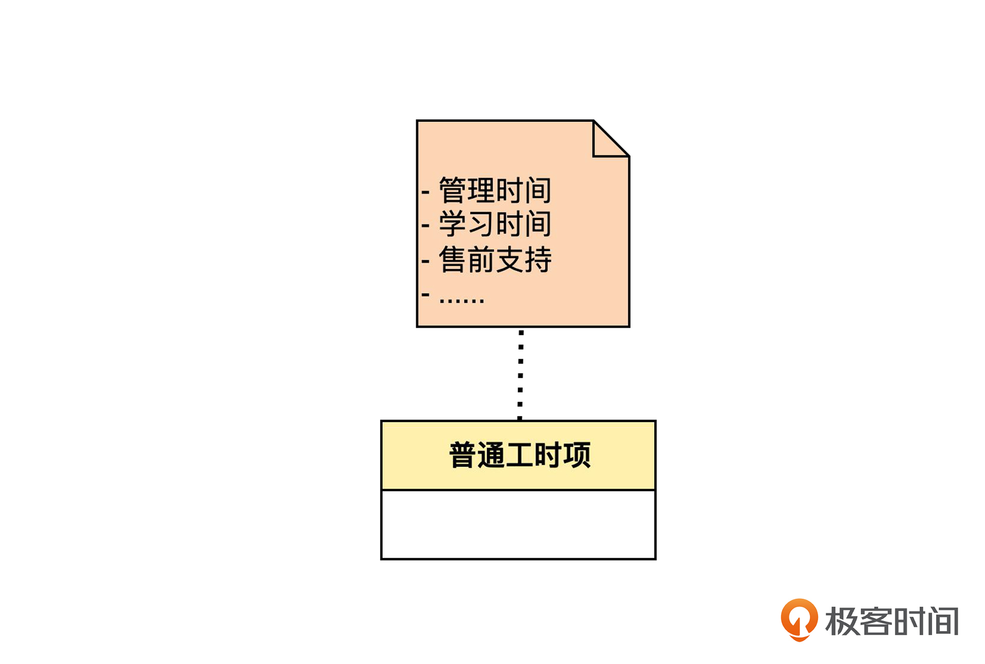 但是我们现在没有这个需求,学习时间和管理时间都是不需要再细分的。这时候,普通工时项就是一个类,而学习时间和管理时间只是这个类的实例,所以就无所谓泛化了。