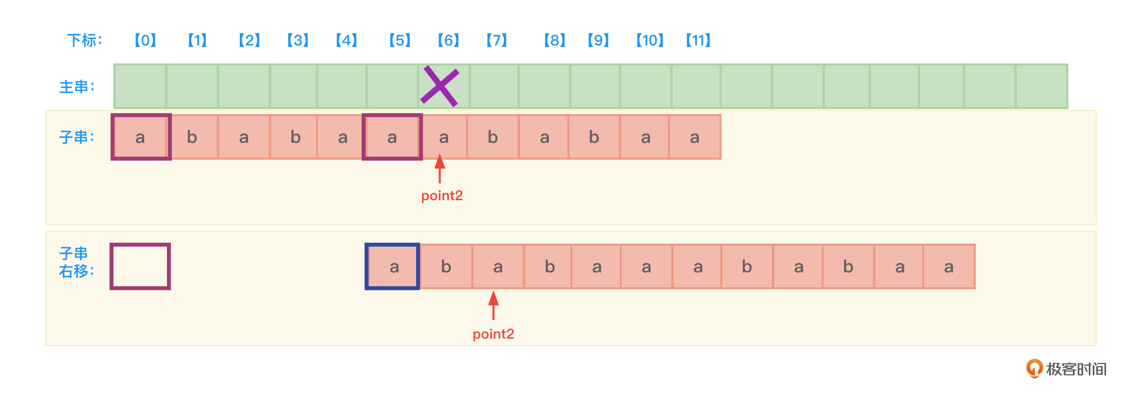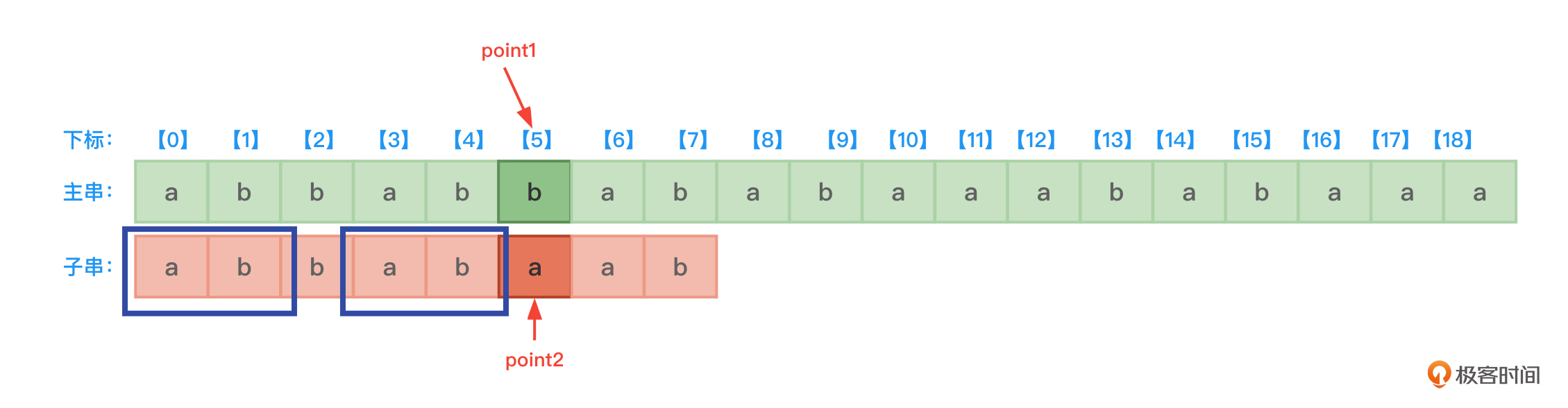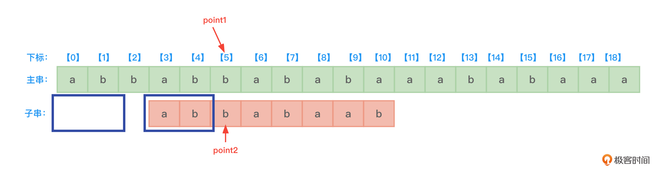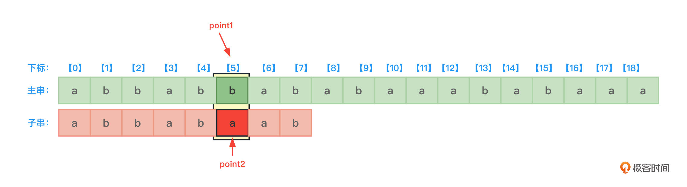 - 下标5位置前的主串和子串中字符相同——都是abbab。