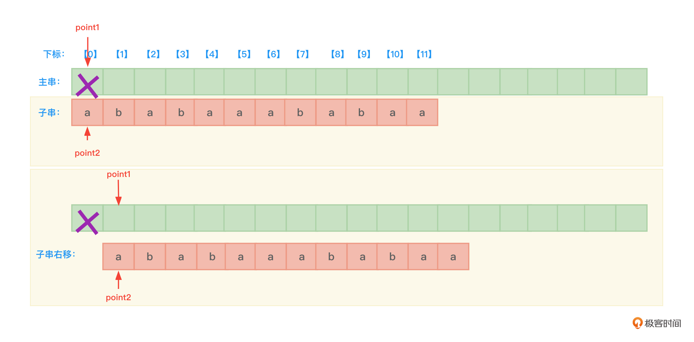 如果下标0位置与主串不匹配,则子串右移一个位置。右移是一个形象的比喻词,这里让指向主串的指针point1右移一个位置,就达到了子串右移一个位置的效果。这样后续可以用子串的第1个字符与主串的第2个字符(下标为1的字符)做比较,如图10所示: