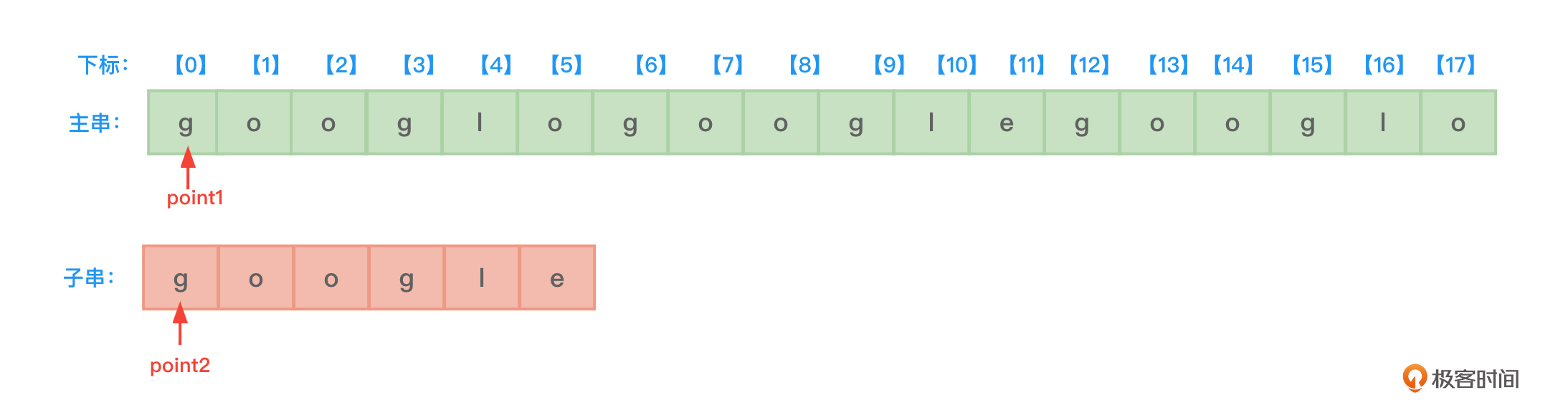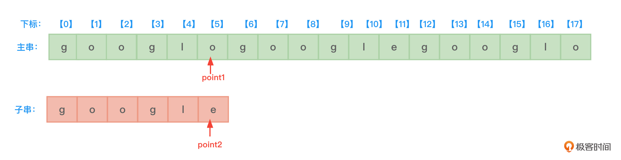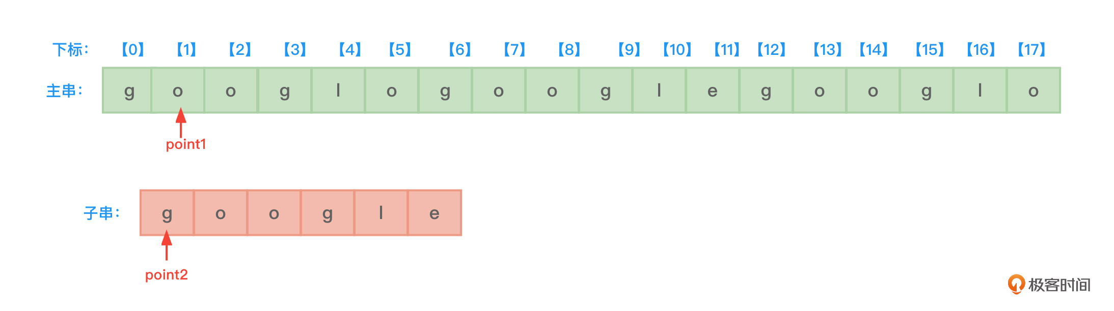 那么point1指针就要从下标为5的位置回退到下标为1的位置,为什么回退到下标为1的位置呢?其实很容易看得出来,只需要把子串位置向右移动一个位置,而后子串的开头字符对应的是哪个下标,主串的指针point1就回退到哪个下标位置,下一次比较就是主串中下标1位置的字符o与子串的开头位置的字符g作比较。如图3所示: