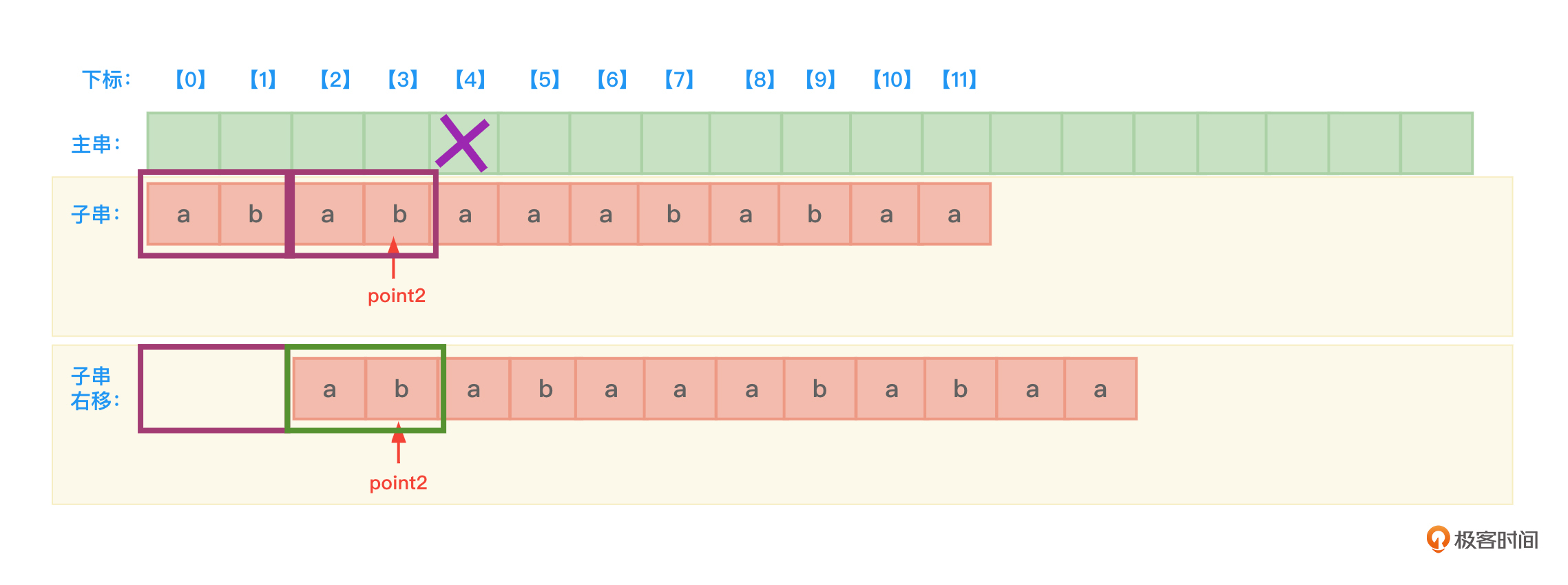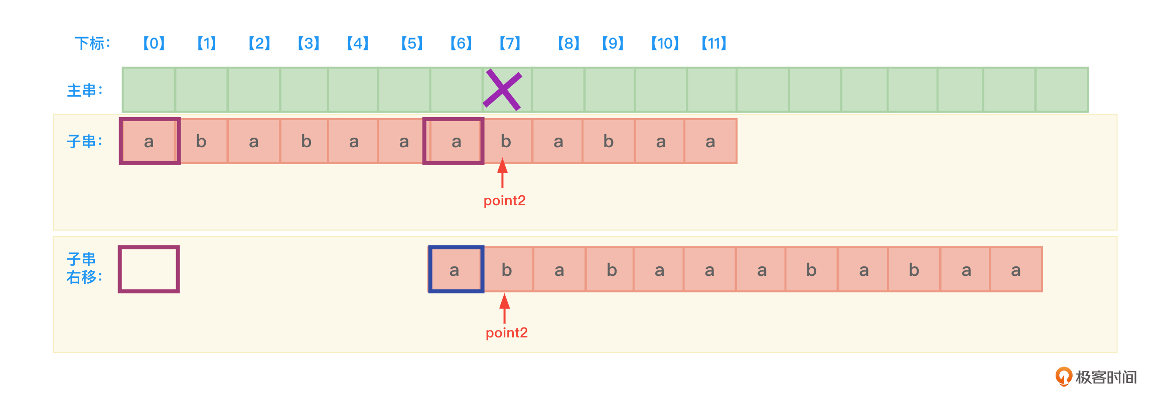 此时,把公共前缀移动到公共后缀的位置。注意看,子串依次向后移动了多个位置,效率肯定更高。那在写程序的时候怎么体现子串向后移动了多个位置呢?其实只是设置一下point2指针的位置不再从字串的0下标开始而是从子串的2下标开始。