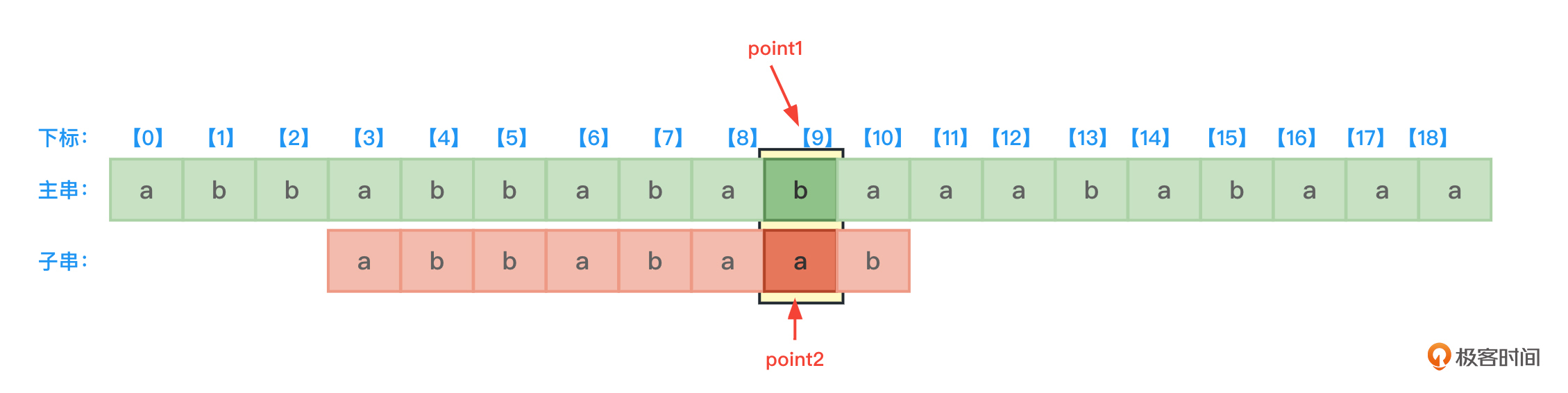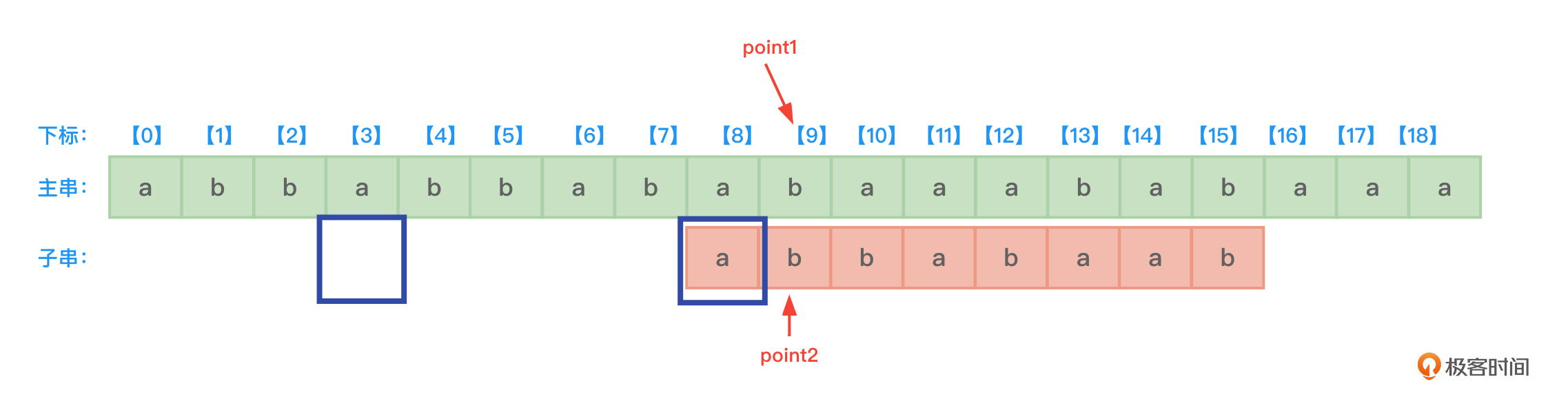 - 下标9号位置子串的字符如果与主串字符不匹配则后续就要用子串的第4个字符(字符b)与主串当前位(9号下标位)字符做比较。