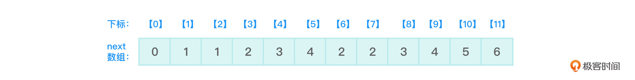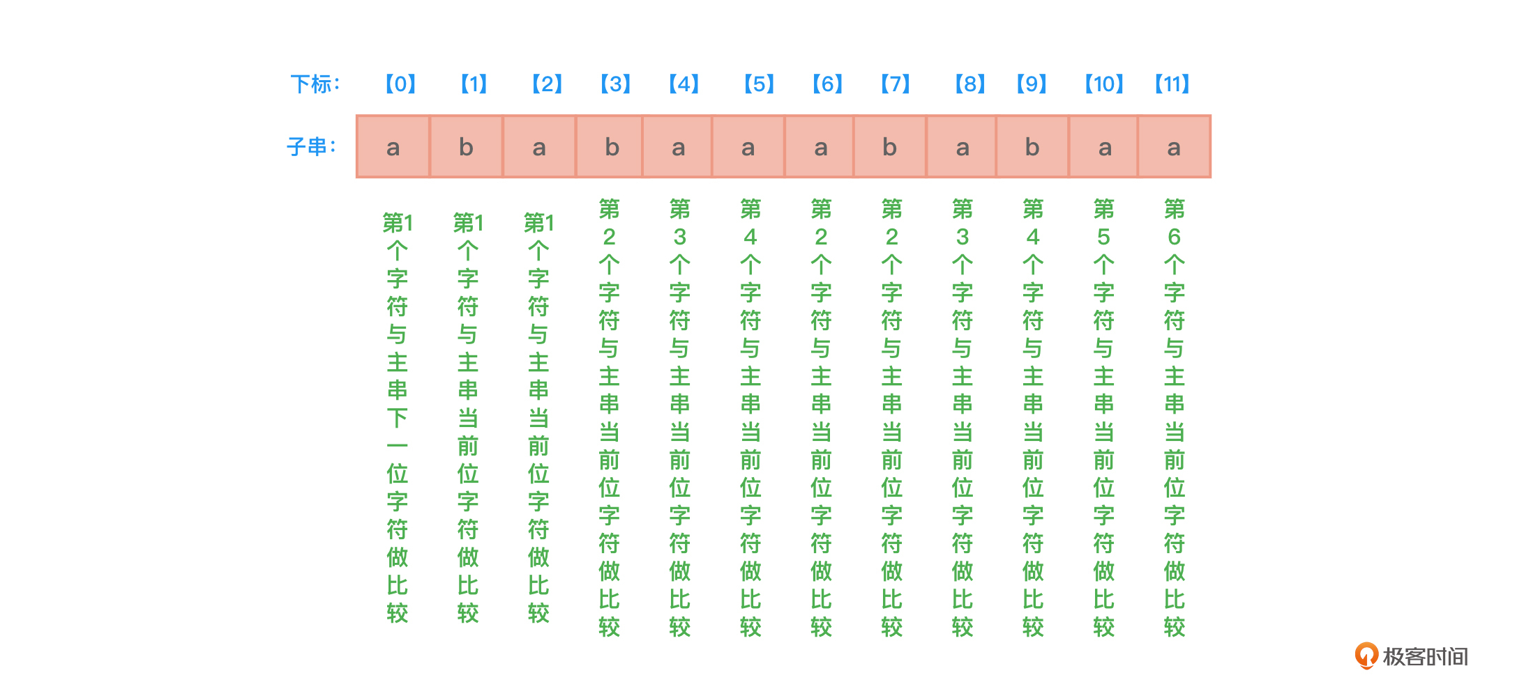 - 下标11号位置子串的字符如果与主串字符不匹配则后续就要用子串的第6个字符(字符a)与主串当前位(11号下标位)字符做比较。