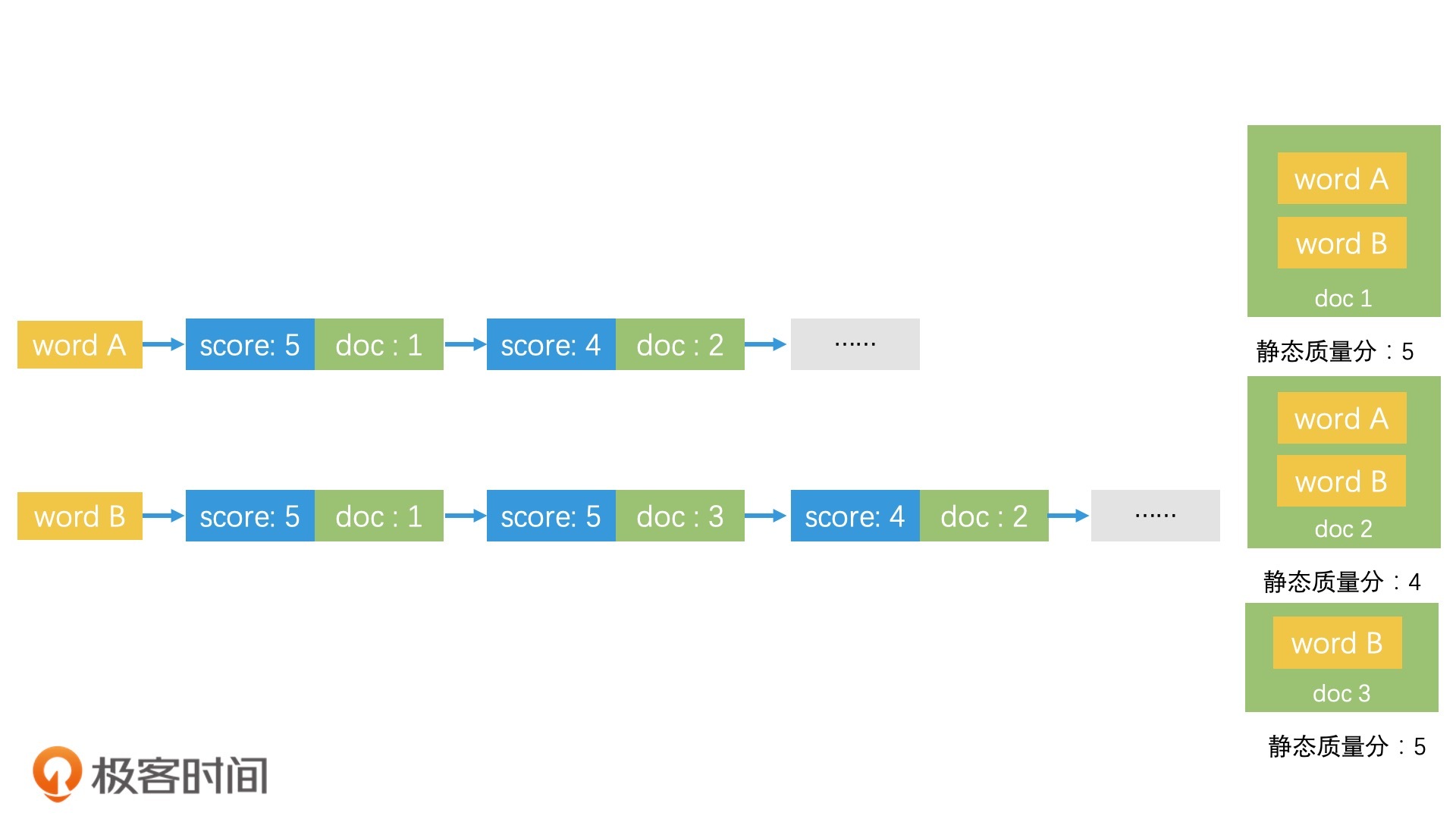 不过,为了能快速返回Top K个结果,我们需要改造一下倒排索引中的posting list的组织方式。我们讲过,倒排索引的posting list都是按文档ID进行排序的。如果希望根据静态质量得分快速截断的话,那我们就应该将posting list按照静态质量得分,由高到低排序。对于分数相同的文档,再以文档ID二次排序。