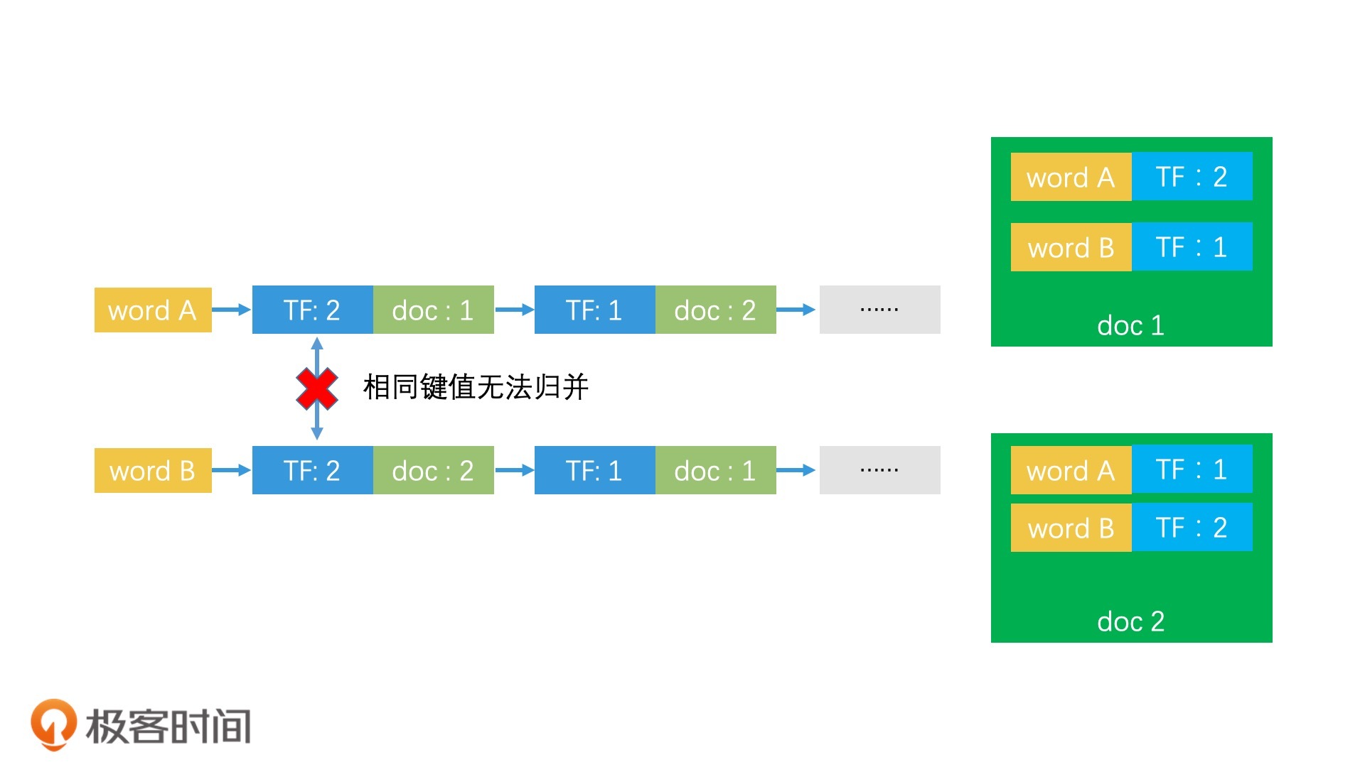 但是如果搜索词中有两个关键词A和B,就可能出现这么一种情况:文档1中出现了2次关键词A,1次关键词B;文档2中出现了1次关键词A,2次关键词B。那么,在关键词A的posting list中,文档1的分数是2,文档2的分数是1,文档1排在文档2前面。但是在关键词B的posting list中,文档2的分数是2,文档1的分数是1,文档2排在文档1前面。