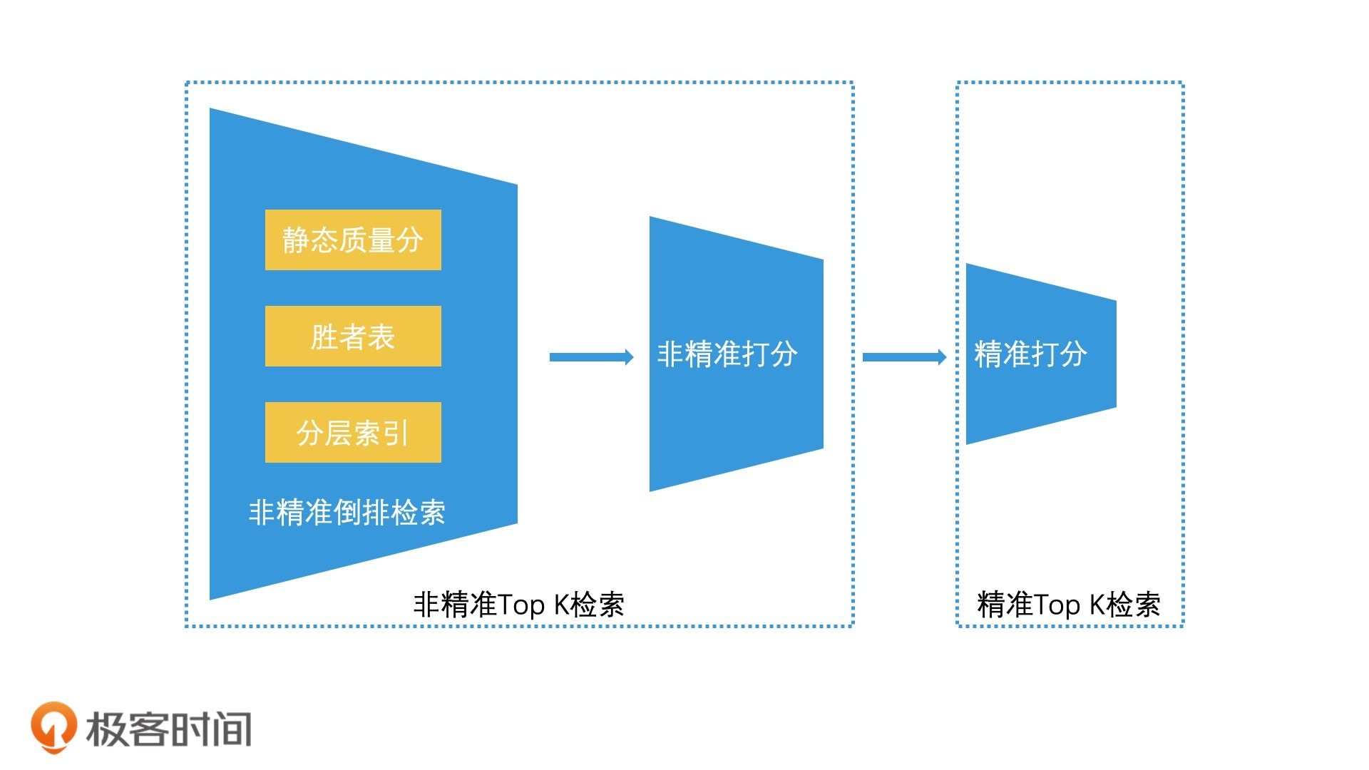 举个例子,如果我们的“精准打分”环节采用的是传统的机器学习打分方式,如逻辑回归、梯度下降树等。那“非精准打分”环节就可以采用相对轻量级的打分方案,比如说采用TF-IDF方案,甚至是BM25方案等。而如果“精准打分”环节采用的是更复杂的深度学习的打分方式,比如使用了DNN模型,那么相对来说,“非精准打分”环节就可以采用逻辑回归这些方案了。