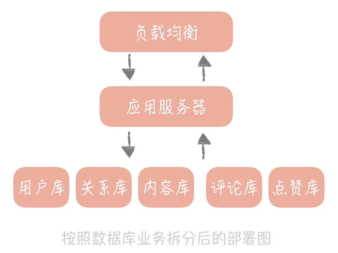 拆分之后,这个简单的社区系统就有了用户库、内容库、评论库、点赞库和关系库。这么做还能隔离故障,某一个库“挂了”不会影响到其它的数据库。