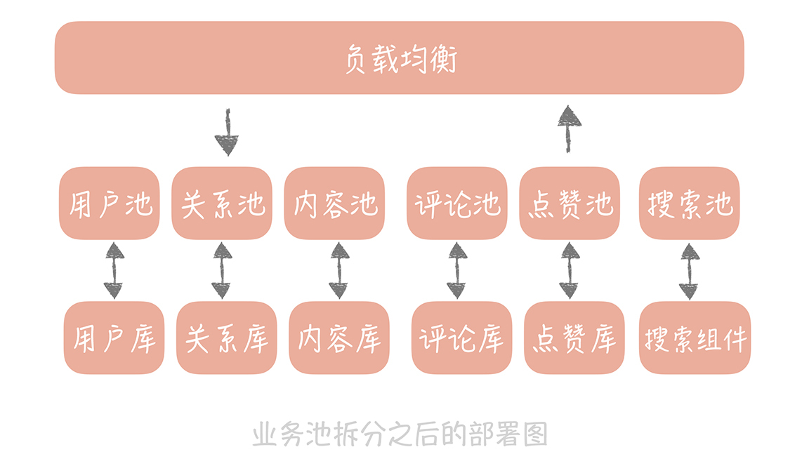 首先,我们需要把相同业务的服务拆分成单独的业务池,比方说上面的社区系统中,我们可以按照业务的维度拆分成用户池、内容池、关系池、评论池、点赞池和搜索池。