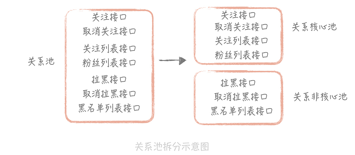 除此之外,我们还可以根据业务接口的重要程度,把业务分为核心池和非核心池。打个比方,就关系池而言,关注、取消关注接口相对重要一些,可以放在核心池里面;拉黑和取消拉黑的操作就相对不那么重要,可以放在非核心池里面。这样,我们可以优先保证核心池的性能,当整体流量上升时优先扩容核心池,降级部分非核心池的接口,从而保证整体系统的稳定性。