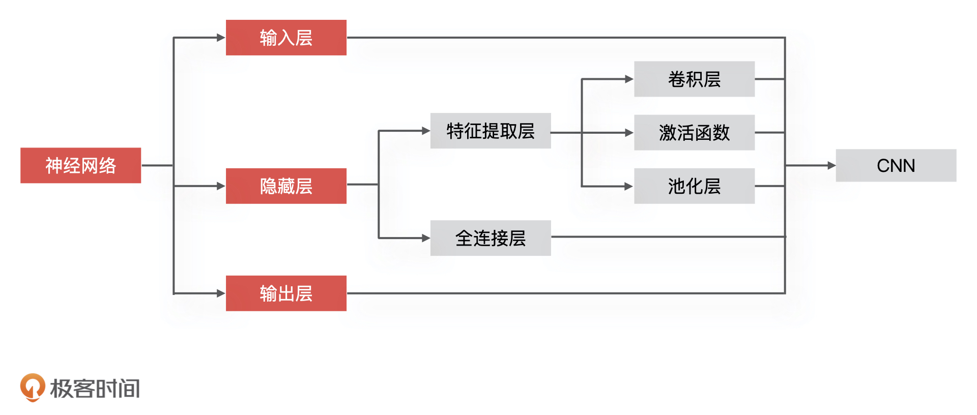因为 CNN 是深度学习的算法之一,所以它同样包含输入层、隐藏层,以及输出层这三大部分,更具体点来说,CNN 的整个组成部分可以分为,数据输入、特征提取、全连接以及输出层四个部分。其中,特征提取、全连接对应神经网络的隐藏层,数据输入和输出层对应神经网络的输入层和输出层。同样的,我也把它和神经网络的对应关系梳理出来了,如下图所示。