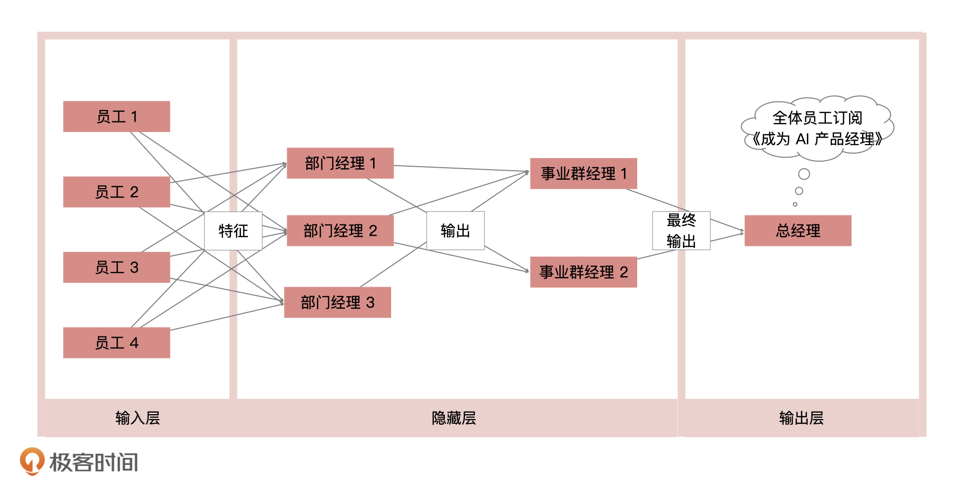 这个例子其实完全可以通过机器学习模型来描述。我们可以把每个“员工”的意见,想象成机器学习中的“特征”,把每一层“领导”对收集上来的意见的整合,想象成当前层级的“输出”,最后把“总经理”收到的结果想象成模型的“最终输出”。这样一来,就形成了一个多层级的机器学习模型,也就是我们说的神经网络。