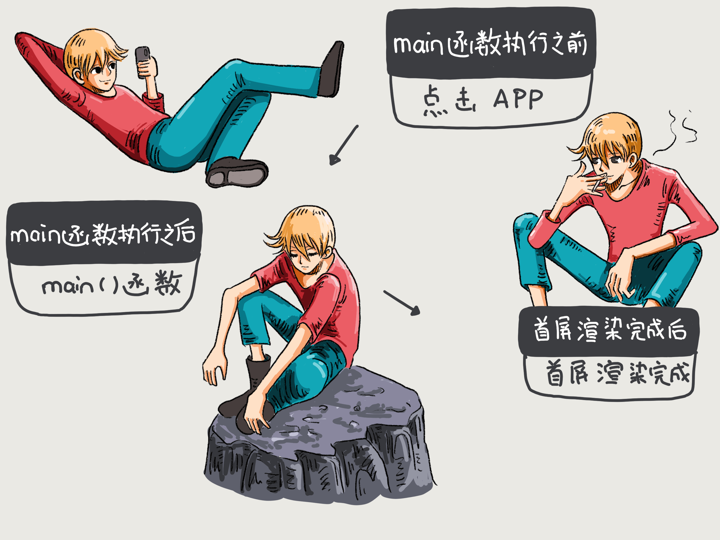 优化的思路是: main() 函数开始执行后到首屏渲染完成前只处理首屏相关的业务,其他非首屏业务的初始化、监听注册、配置文件读取等都放到首屏渲染完成后去做。如下图所示: