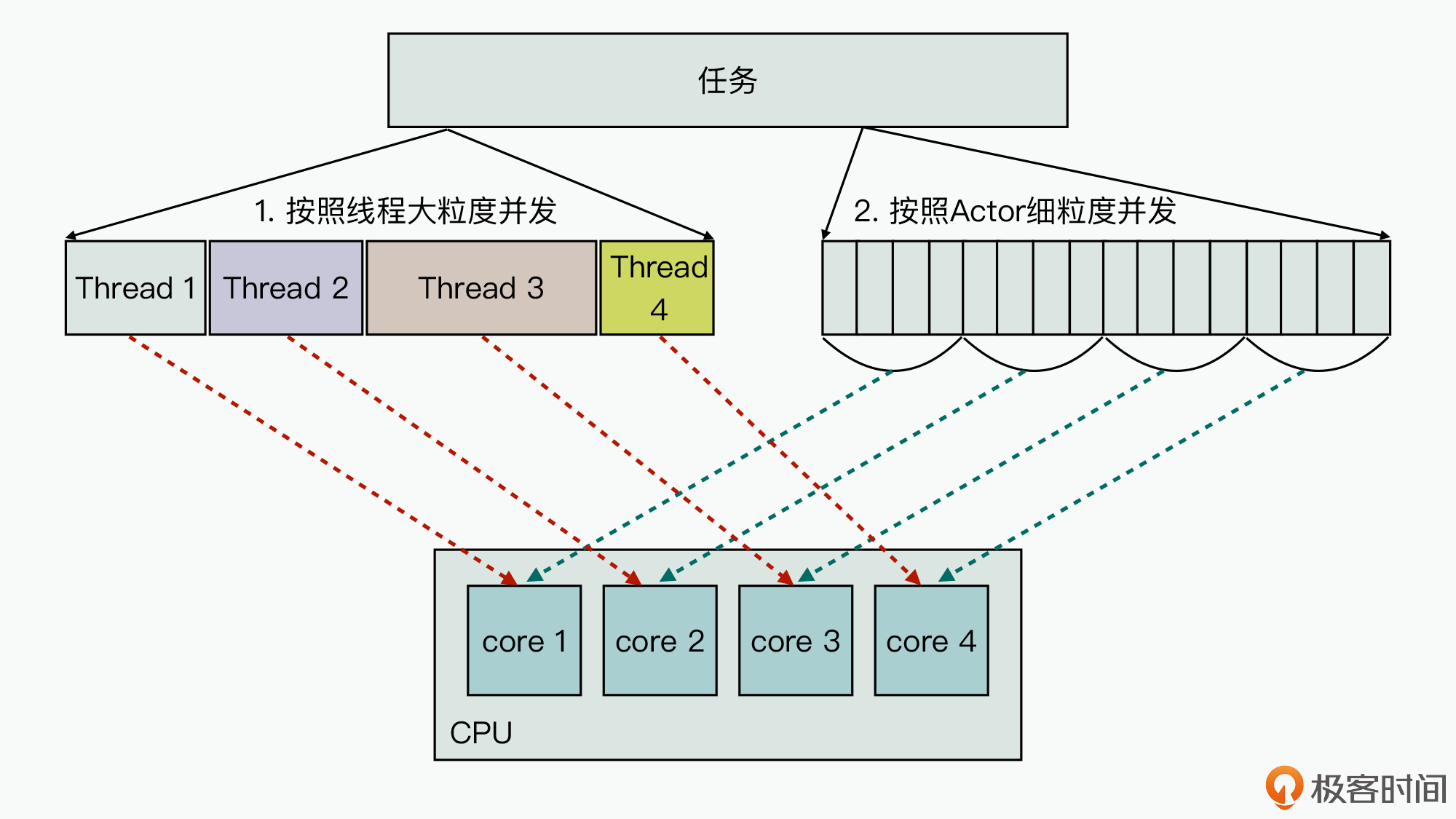 而图中右侧的方法2,代表的是Actor的细粒度任务拆分,它可以把业务功能拆分成大量的轻量级的Actor子任务。而由于每个Actor都非常轻量,Akka的底层调度框架就可以将这些Actor子任务均匀地分布到多个CPU硬件核上,从而可以最大化地发挥CPU的性能。