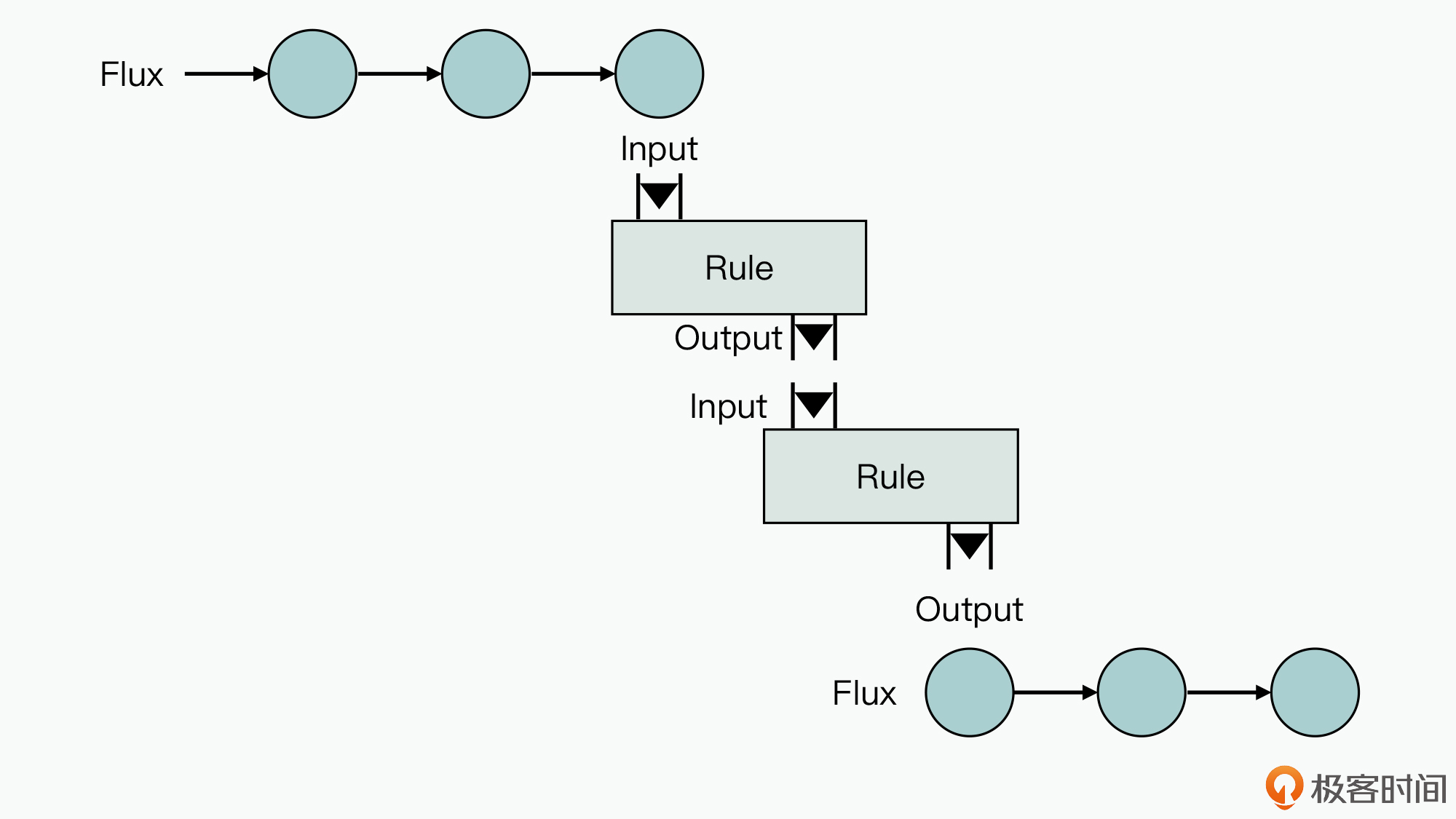 如上图所示,输入流Flux就是Reactor中典型的异步消息流,它代表了一个包含0个到N个的消息序列。另外,图中的Rule代表的是一个基于消息的处理逻辑或规则,输入流中的消息可以被中间多个处理逻辑组合连续加工之后,再生成一个包含0个到N个的输出消息流Flux。
