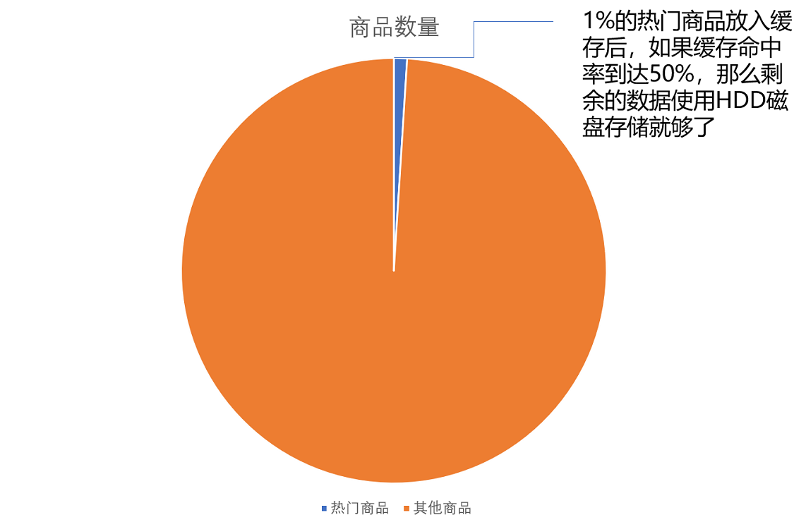 如果我们只在内存里放前1%的热门商品,也就是600万件热门商品,而把剩下的商品,放在机械式的HDD硬盘上,那么,我们需要的存储成本就下降到45.6万美元( = 3600 万美元 × 1% + 2400TB / 1MB × 0.00004 美元),是原来成本的1.3%左右。