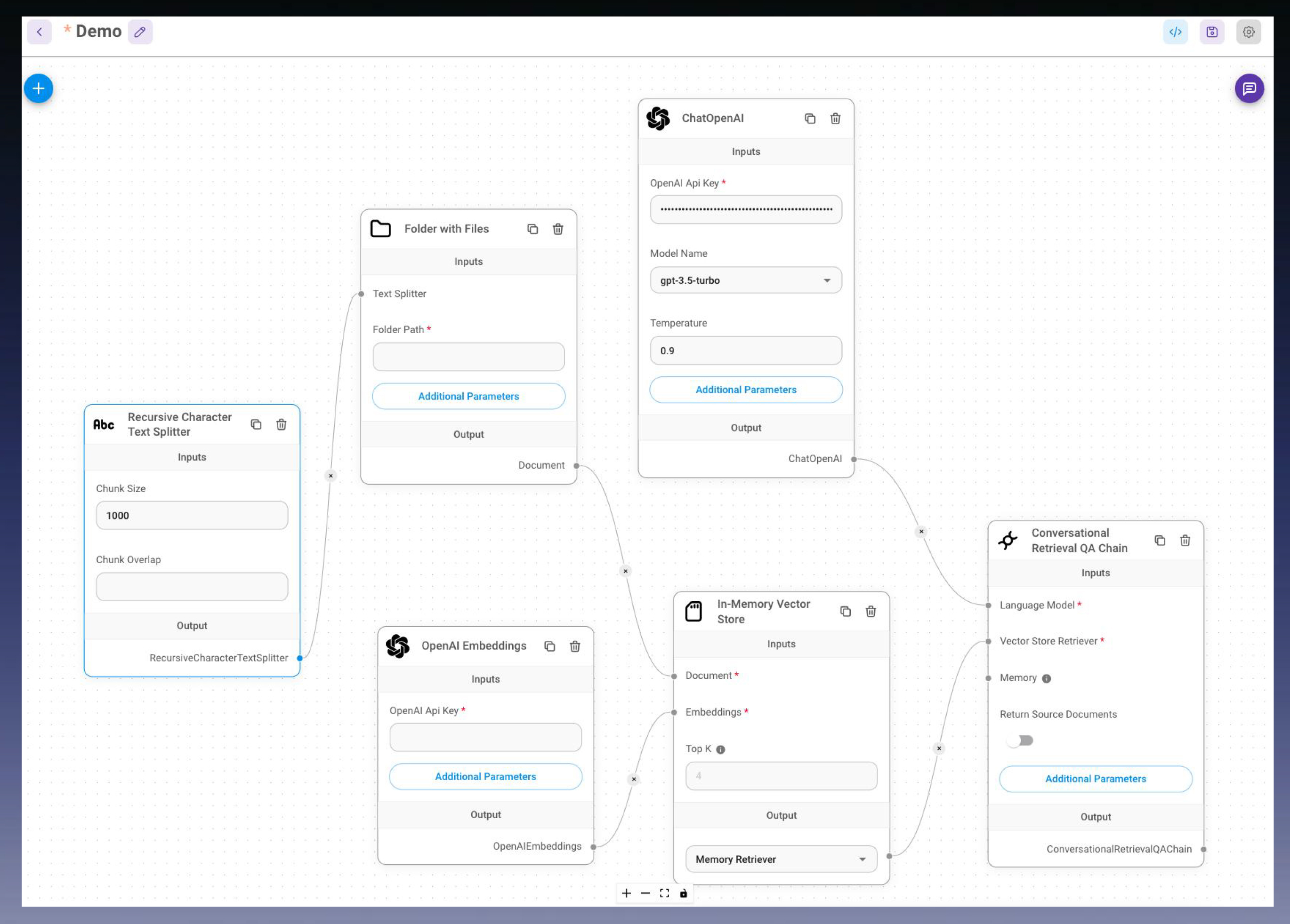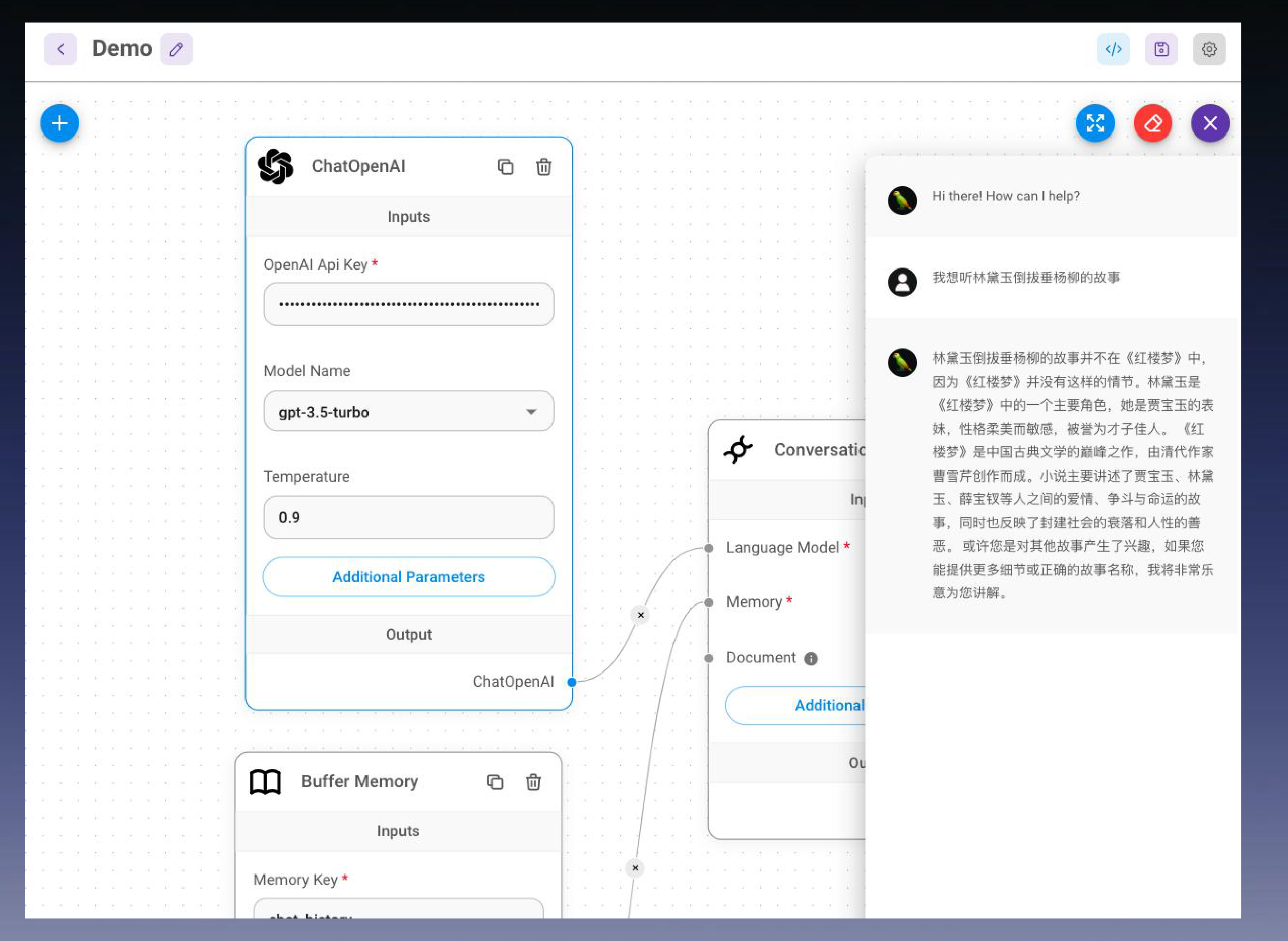 - Conversational Retrieval QA Chain 组件则会根据问题,获得外部知识,在LLM思考形成回答后返回给用户问题答案。