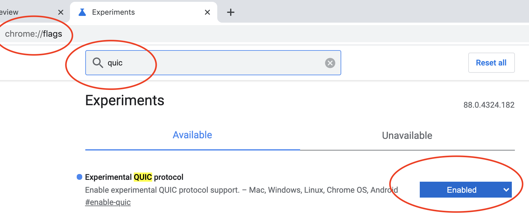 首先要在地址栏输入“chrome://flags”,打开设置页面,然后搜索“QUIC”,找到启用QUIC的选项,把它改为“Enabled”,具体可以参考下面的图片。