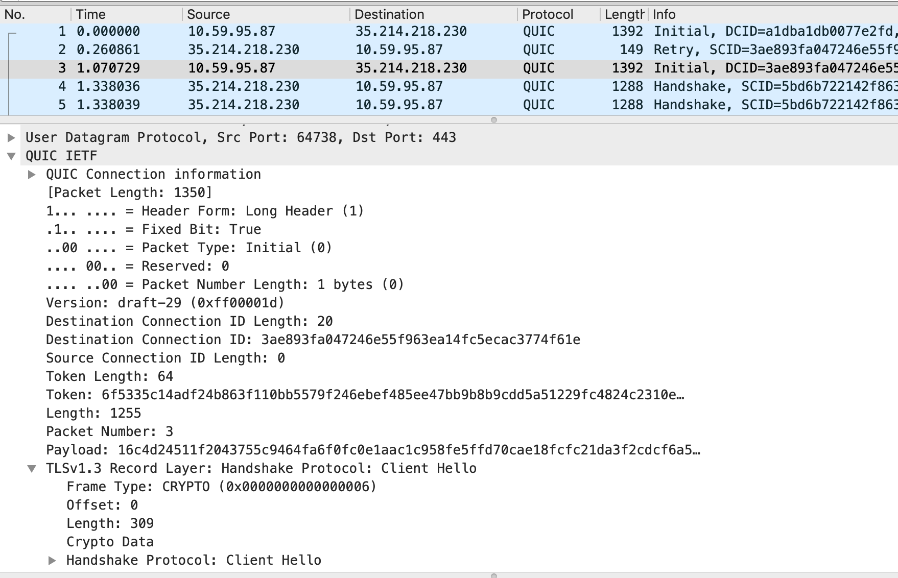 标志位字节后面是4字节的版本号,因为目前还是草案,所以显示的是“draft-29”。再后面,是QUIC的特性之一“连接ID”,长度为20字节的十六进制字符串。