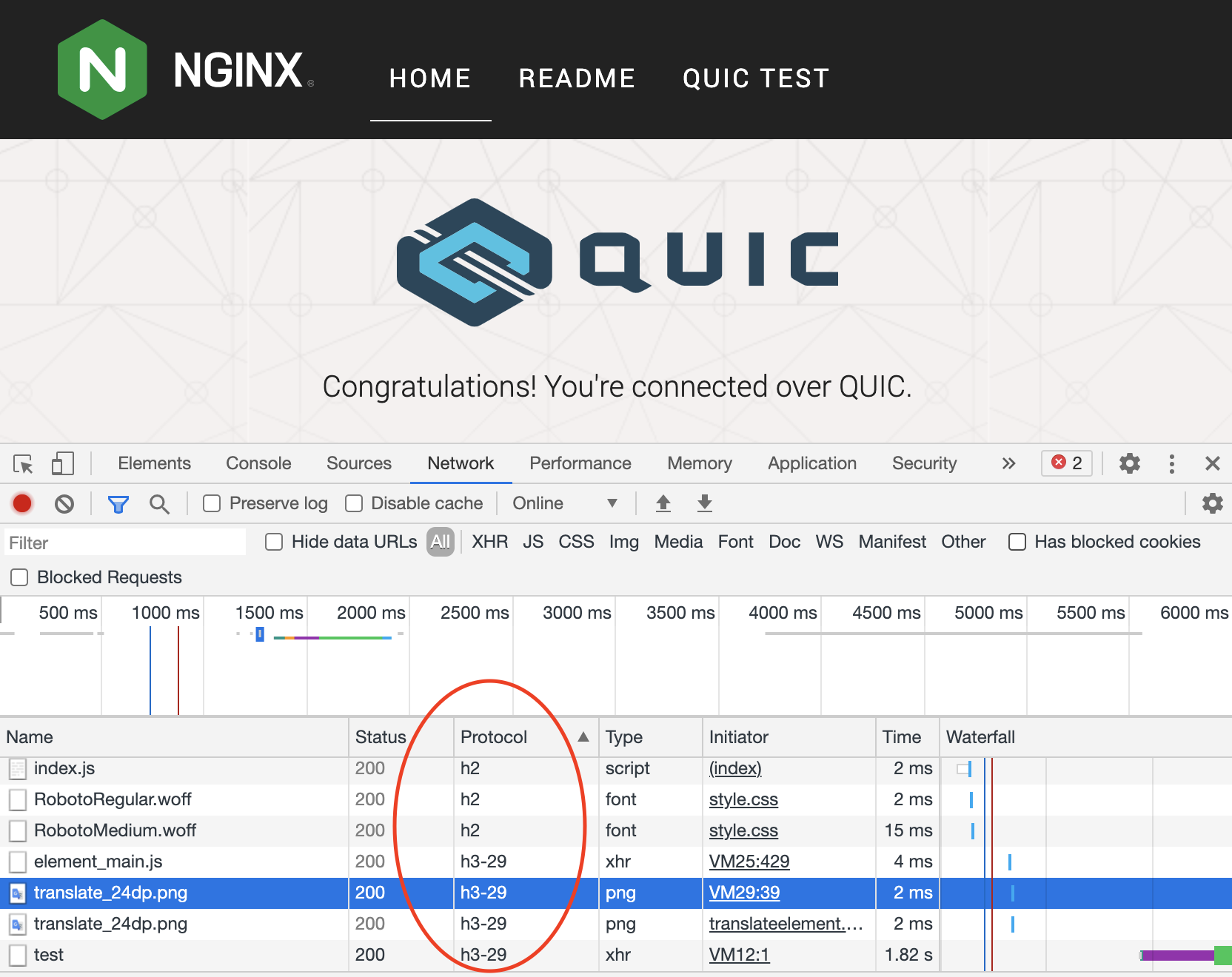 打开浏览器窗口,输入测试网站的URI(https://quic.nginx.org/),如果“运气好”,刷新几次就能够在网页上看到大大的QUIC标志了。