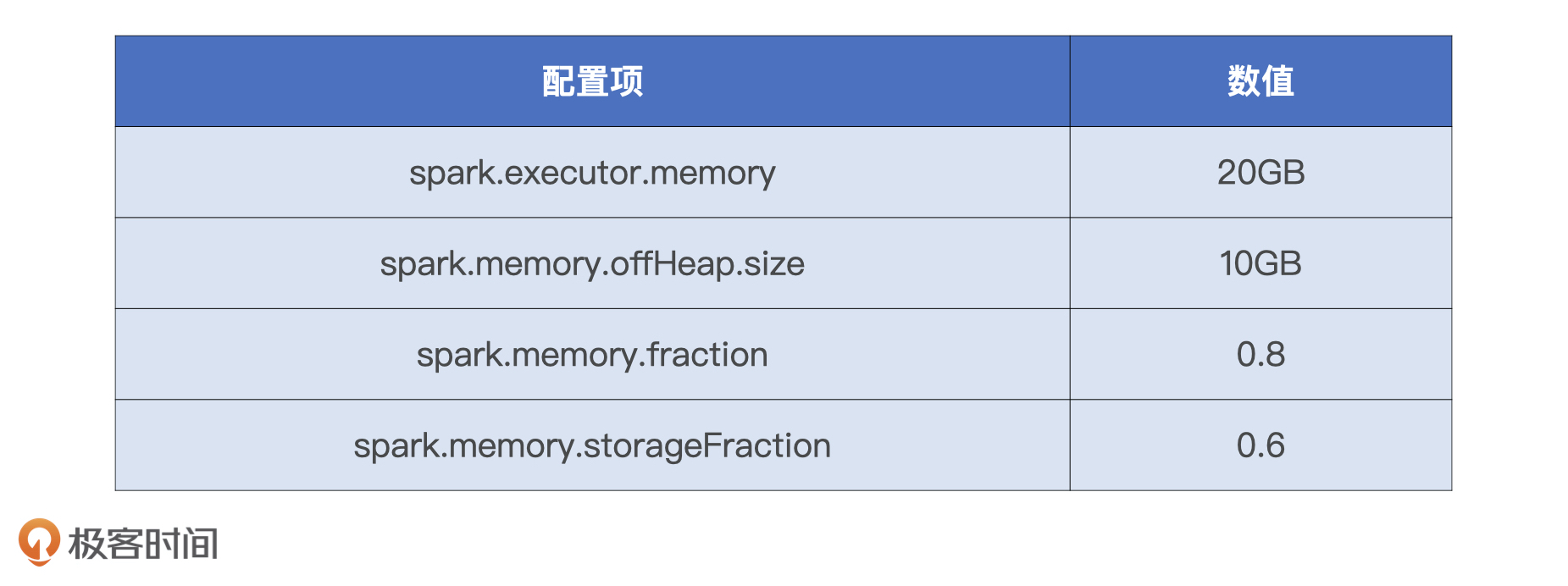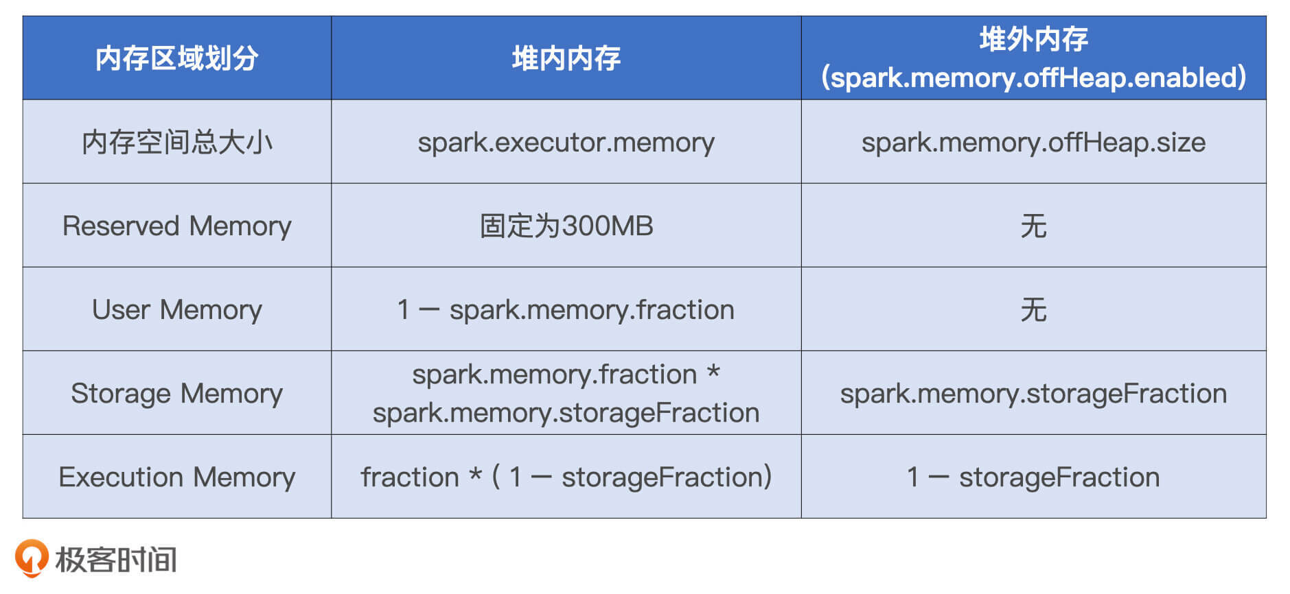 好了,这些就是内存管理的基础知识。当然了,与内存相关的话题还有很多,比如内存溢出、RDD缓存、内存利用率,以及执行内存的并行计算等等。在性能调优篇,我还会继续从内存视角出发,去和你探讨这些话题。