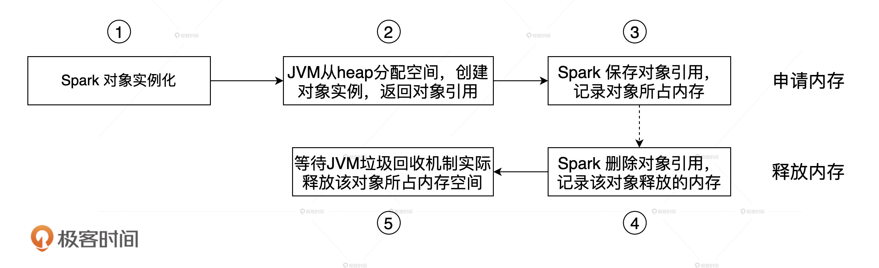 **其中,堆内内存的申请与释放统一由JVM代劳。**比如说,Spark需要内存来实例化对象,JVM负责从堆内分配空间并创建对象,然后把对象的引用返回,最后由Spark保存引用,同时记录内存消耗。反过来也是一样,Spark申请删除对象会同时记录可用内存,JVM负责把这样的对象标记为“待删除”,然后再通过垃圾回收(Garbage Collection,GC)机制将对象清除并真正释放内存。