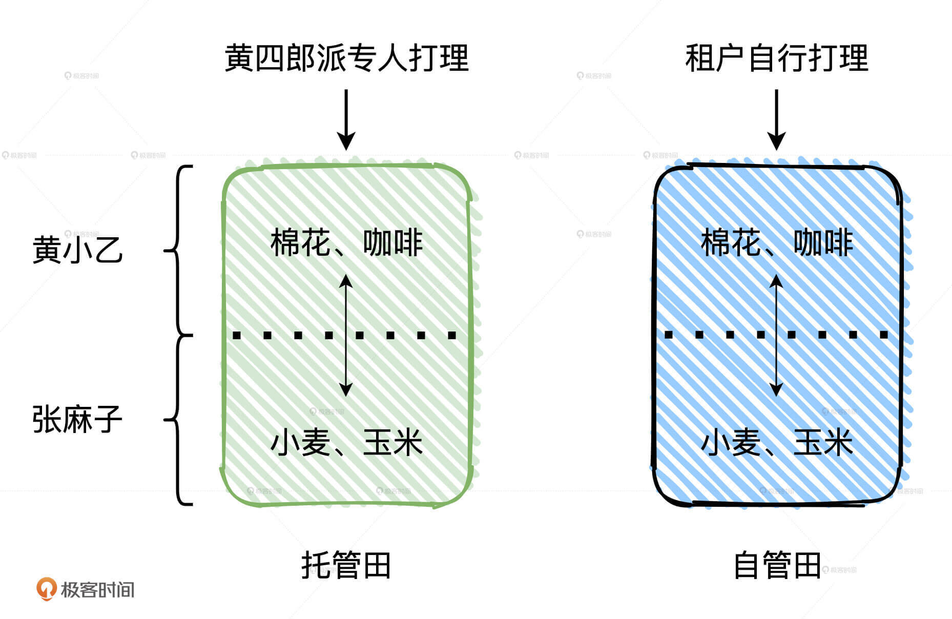 我们知道,庄稼丰收之后,田地需要翻土、整平、晾晒,来年才能种下一茬庄稼。那么,托管田指的就是丰收之后,由黄四郎派专人帮你搞定翻土、整平这些琐事,不用你操心。相应的,自管田的意思就是庄稼你自己种,秋收之后的田地也得你自己收拾。
