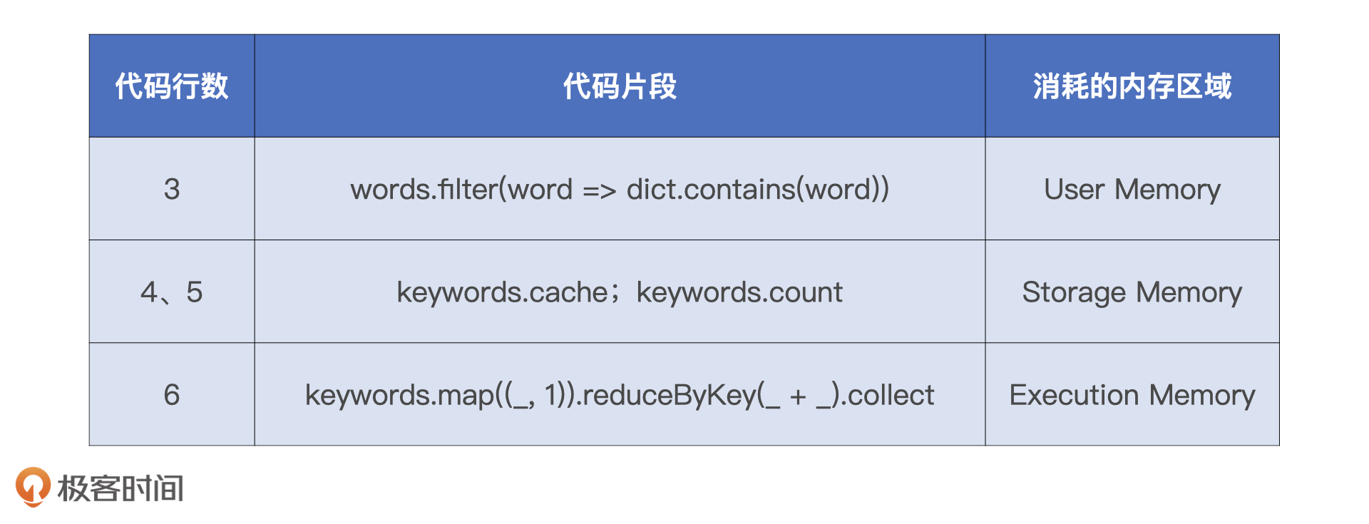 接着,第四行和第五行用cache和count对keywords RDD进行缓存,以备后续频繁访问,分布式数据集的缓存占用的正是Storage Memory内存区域。在最后一行代码中,我们在keywords上调用reduceByKey对单词分别计数。我们知道,reduceByKey算子会引入Shuffle,而Shuffle过程中所涉及的内部数据结构,如映射、排序、聚合等操作所仰仗的Buffer、Array和HashMap,都会消耗Execution Memory区域中的内存。