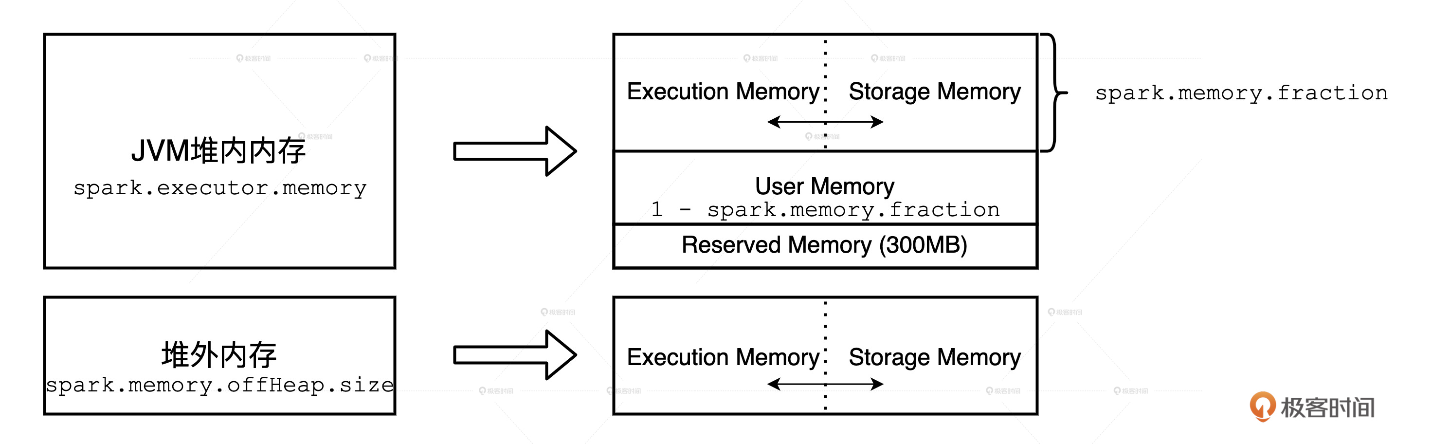 我们先来说说堆外内存。Spark把堆外内存划分为两块区域:一块用于执行分布式任务,如Shuffle、Sort和Aggregate等操作,这部分内存叫做Execution Memory;一块用于缓存RDD和广播变量等数据,它被称为Storage Memory。