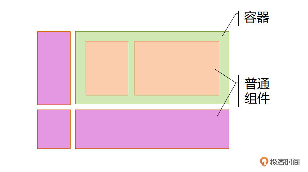 为了计算的方便,我们来对UI做一些抽象,和CSS的盒子模型相似,我们可以把界面抽象为一个个的盒子。有的盒子里还能装下其他的盒子,这种盒子我们称为容器,把容器之外的统统称为普通组件。这样一来,某一个界面就可以画成这样了。